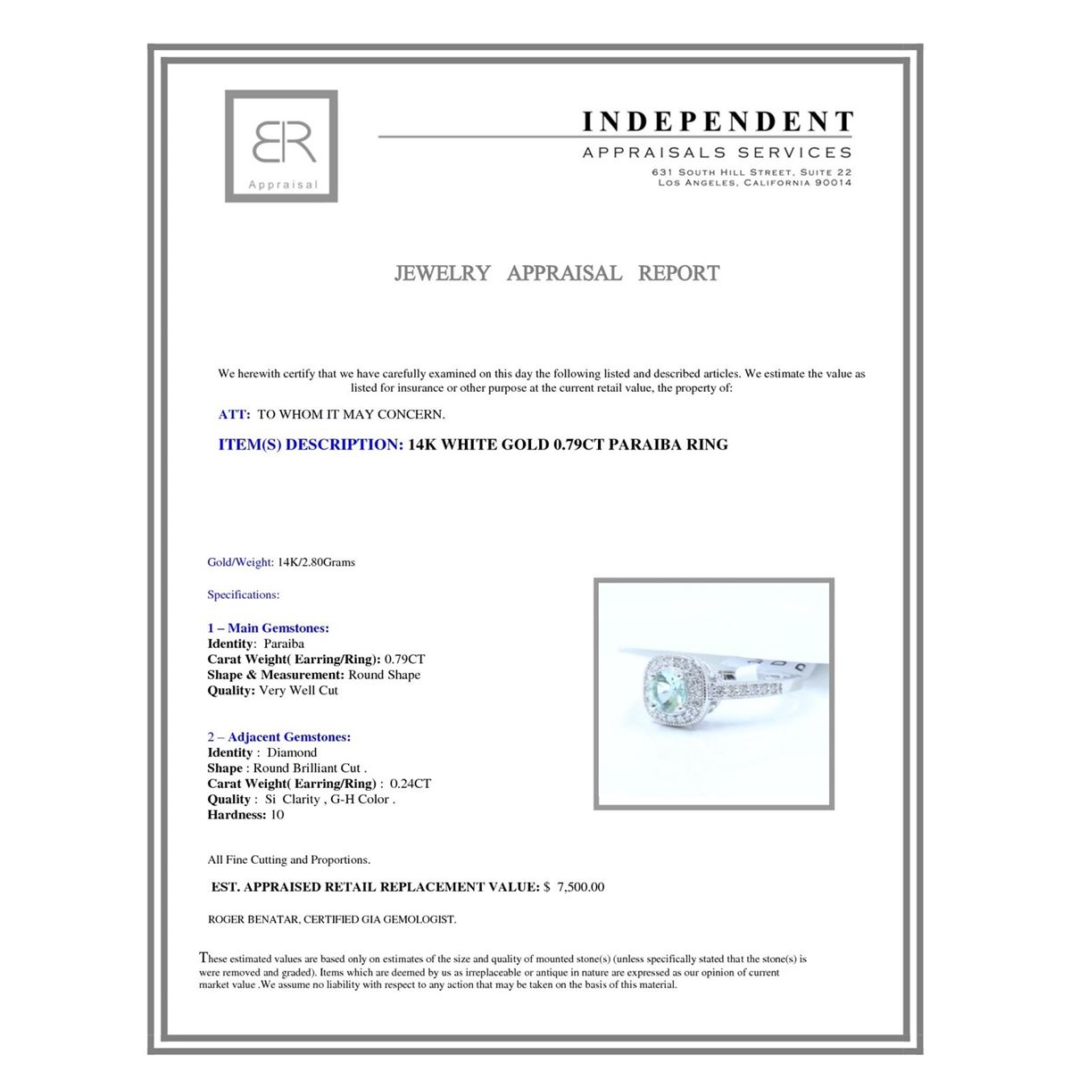 14K W/G NATURAL COPPER BEARING PARAIBA TORMALINE RING :5.07GM/DIA :0.24CT/PARAIBA :0.79CT/#GVR1403