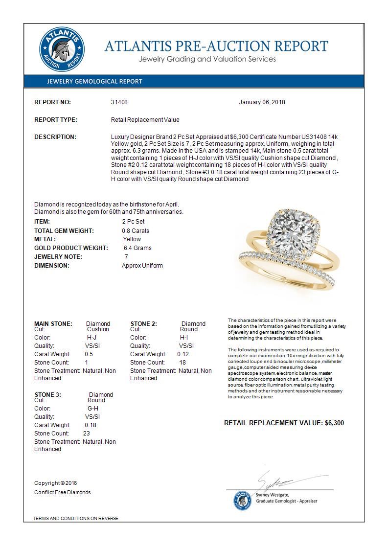 REF-143K5W -31408 ---- 0.8 CTW Certified VS/SI Cushion Diamond 2Pc Set Solitaire Halo 14K Yellow Gold ---- Luxury Designer Brand 2 Pc Set Appraised at $6,300 Certificate Number US31408 14k Yellow gold, 2 Pc Set Size is 7, 2 Pc Set measuring approx. Uniform, weighing in total approx. 6.3 grams. Made in the USA and is stamped 14k, Main stone 0.5 carat total weight containing 1 pieces of H-J color with VS/SI quality Cushion shape cut Diamond , Stone #2 0.12 carat total weight containing 18 pieces of H-I color with VS/SI quality Round shape cut Diamond , Stone #3 0.18 carat total weight containing 23 pieces of G-H color with VS/SI quality Round shape cut Diamond