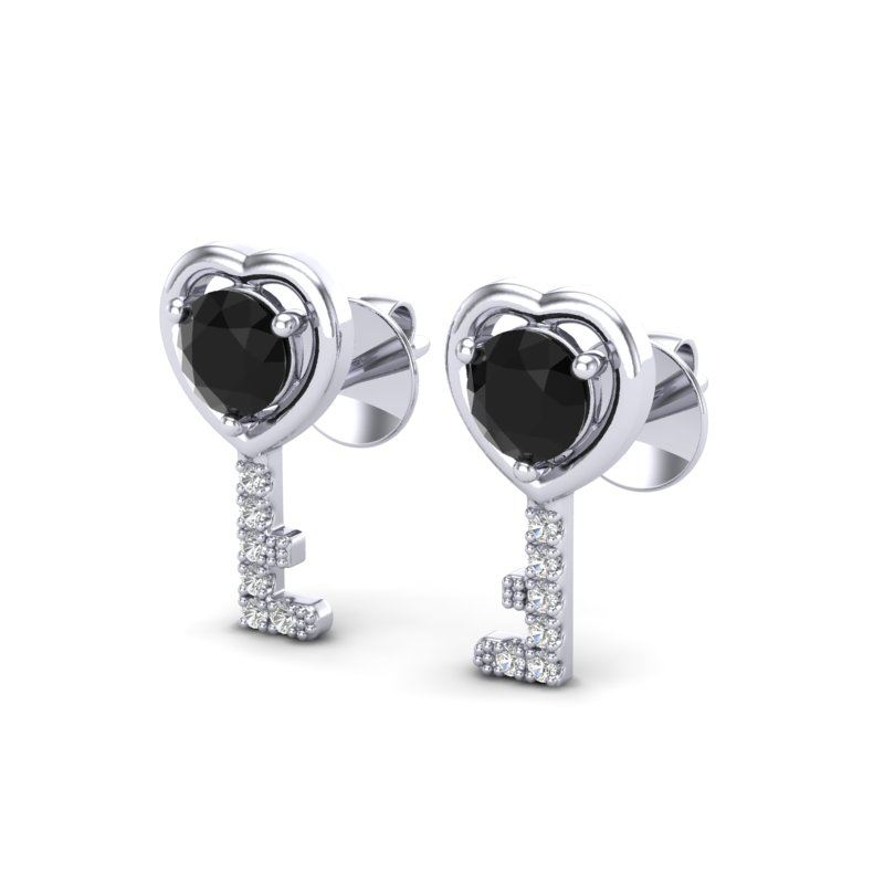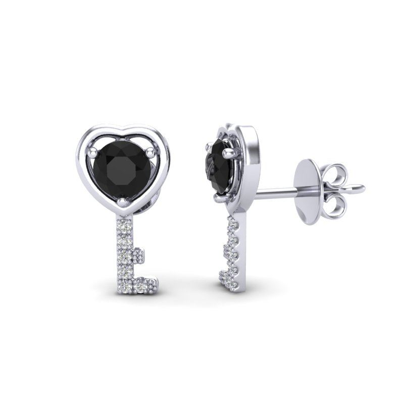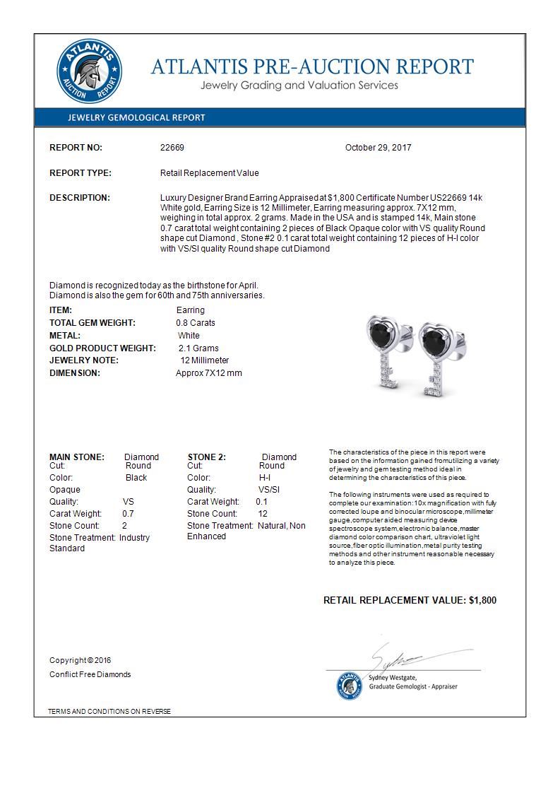 REF-32W5F -22669 ---- 0.80 CTW Black VS/SI Diamond Micro Key To The Heart Earrings 14K White Gold ---- Luxury Designer Brand Earring Appraised at $1,800 Certificate Number US22669 14k White gold, Earring Size is 12 Millimeter, Earring measuring approx. 7X12 mm, weighing in total approx. 2 grams. Made in the USA and is stamped 14k, Main stone 0.7 carat total weight containing 2 pieces of Black Opaque color with VS quality Round shape cut Diamond , Stone #2 0.1 carat total weight containing 12 pieces of H-I color with VS/SI quality Round shape cut Diamond