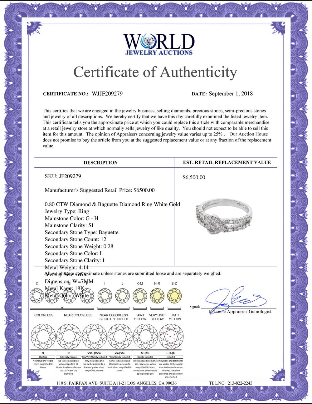 WORLD JEWELRY AUCTION believes to the best of its knowledge that the information presented in any listing has come from reliable sources. Such information is presented solely for the convenience of the Purchaser. WJA makes no warranties of any kind related to the information presented in any listing. WJA further makes no warranties, either express or implied, relating to the value, marketability or condition of the lot described in any listing. Prospective bidders should investigate a lot thoroughly before bidding. By bidding the Bidder acknowledges that Bidder has investigated the lot to his or her satisfaction, or, that Bidder has chosen not to do so, and agrees to accept the lot being bid on with no objections after the sale closes. If you are uncertain please contact us with your questions prior to bidding. If you are still uncertain after we reply, please refrain from bidding. Photos other graphic material contained in any listing of generic or duplicate lots may be stock presentations and not necessarily of the specific lot.