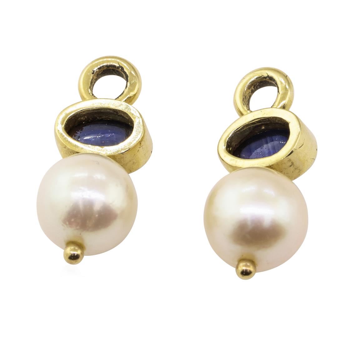 One pair of earring enhancers measuring 17 millimeters in length featuring: 14KT yellow gold weighing 2.4 grams containing two oval cabochon blue sapphires weighing 0.80 ctw and two pearls measuring 7.3 millimeters in diameter.