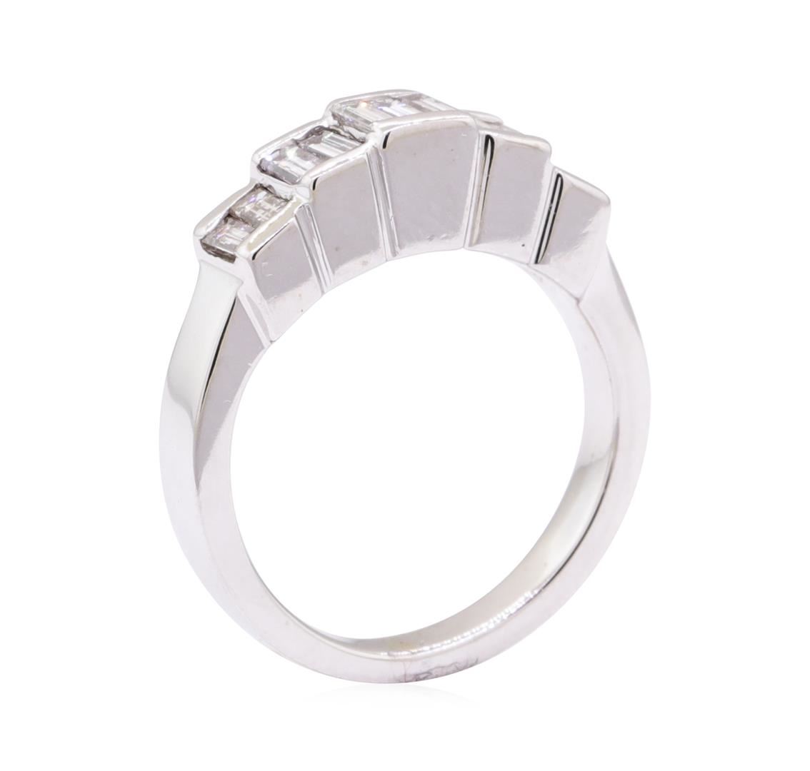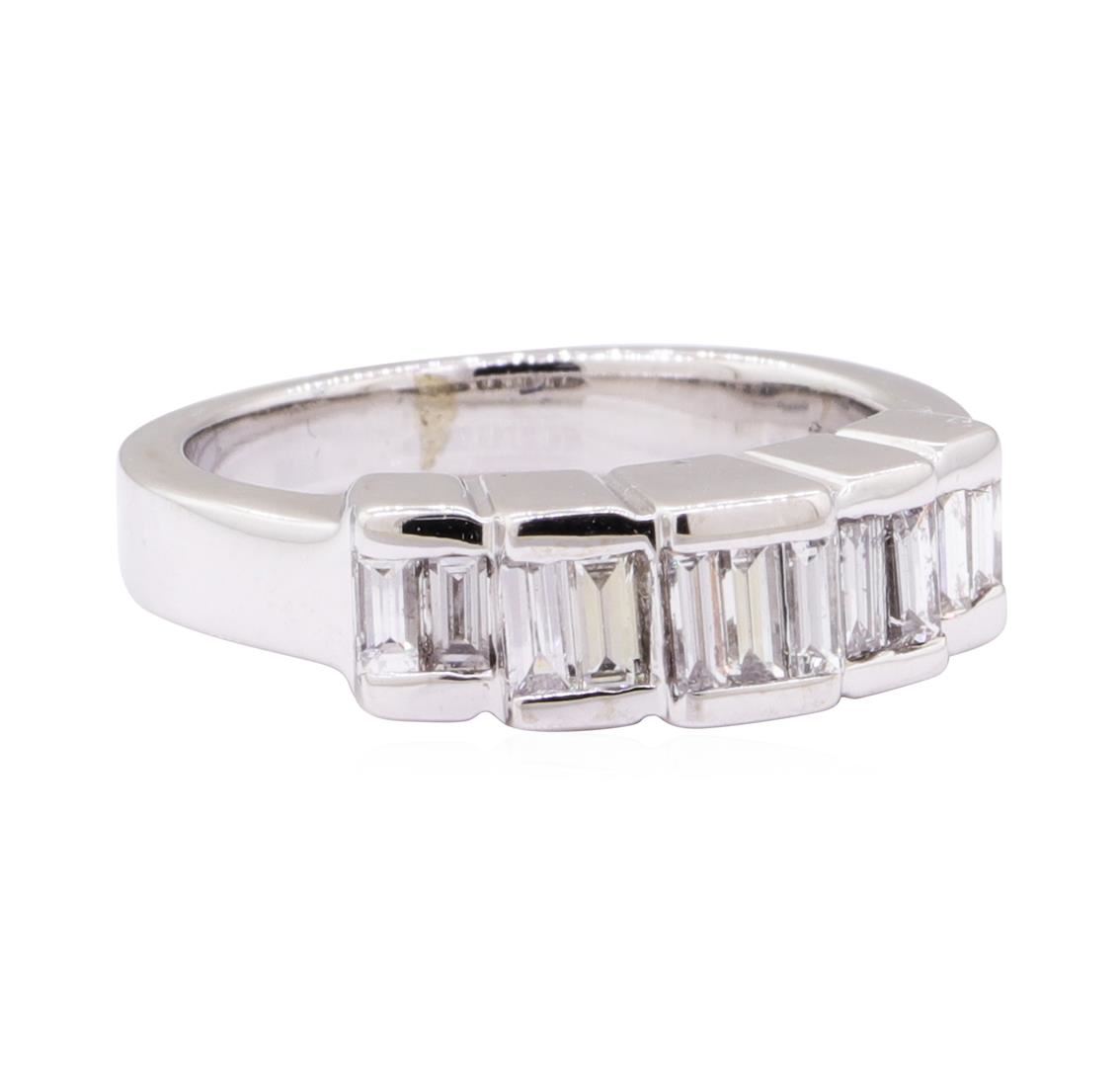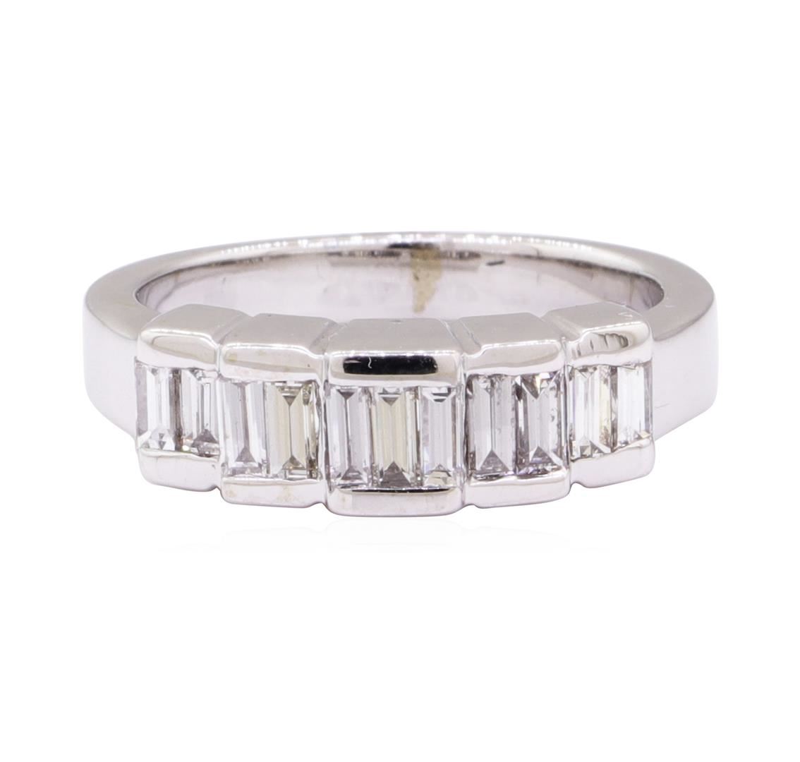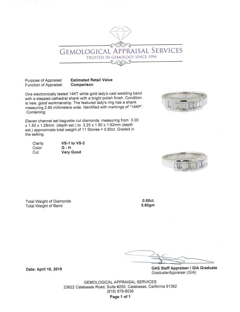 One electronically tested 14KT white gold lady's cast wedding band with a stepped cathedral shank with a bright polish finish. The featured lady's ring has a shank measuring 2.85 millimeters wide. Identified with markings of '14KP'. Condition is new, good workmanship. Containing: Eleven channel set baguette cut diamonds, measuring from 3.00 x 1.50 x 1.28mm (depth est.) to 3.25 x 1.90 x 1.62mm (depth est.) approximate total weight of 11 Stones = 0.80ct. Graded in the setting. Color G - H Clarity VS-1 to VS-2 Cut Very Good. Total Weight of Diamonds 0.80ct.. Total Weight of Band 5.60gm GAS Appraised at $2740.00. GAS Appraised at $2,740.00.