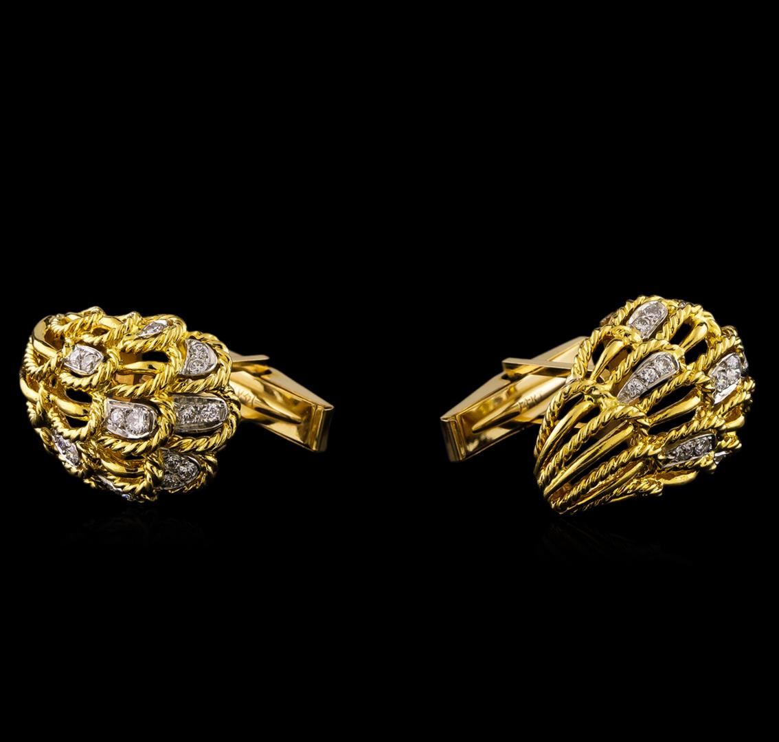 One pair electronically tested 14KT yellow gold cast & assembled diamond cuff links. Each cuff link features a one inch long elaborate lattice curvature with diamond accents, completed by a swiveling hinged rectangular back. Bright and patterned finish with rhodium accents. Identified with markings of "14K". Condition is good. Containing: Two prong set round brilliant cut diamonds, measuring 2.60 - 2.50 x 1.53mm (depth est.) approximate total weight of 2 Stones = 0.13ct. Graded in the setting. Clarity: VS-2 to SI-1. Color: G Twenty-Three prong set round brilliant cut diamonds, measuring 2.00 - 1.70 x 1.11mm (depth est.) approximate total weight of 23 Stones = 0.55ct. Graded in the setting. Clarity: VS-2 to SI-2. Color: F - H Nine prong set round brilliant and single cut diamonds, measuring 1.60 x 1.30 x 0.87mm (depth est.) approximate total weight of 9 Stones = 0.12ct. Graded in the setting. Clarity: VS-2 to SI-2. Color: F - H. Total Weight of Diamonds 0.80ct. Total Weight of Cuff Links 20.76gm. AIG Appraised at $6,570.00.
