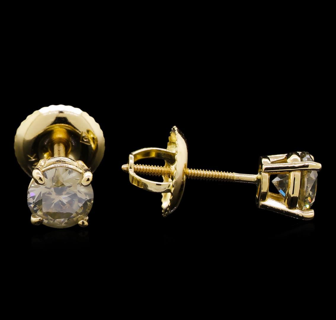 One pair electronically tested 14KT yellow gold cast & assembled diamond solitaire earrings with screw backs. Bright polish finish. Condition is new, good workmanship. Containing: One prong set round brilliant cut diamond, measuring 4.62 - 4.60 x 3.00mm (depth est.) approximate weight of 0.41ct. Graded in the setting. Clarity: I-1. Depth: 65.1%. Table 54.2%. One prong set round brilliant cut diamond, measuring 4.64 - 4.60 x 2.80mm (depth est.) approximate weight of 0.39ct. Graded in the setting. Clarity: I-1. Depth: 60.6%. Table 56.3%. Total Weight of Diamonds 0.80ct. Total Weight of Earrings 1.06gm. AIG Appraised at $1,355.00.
