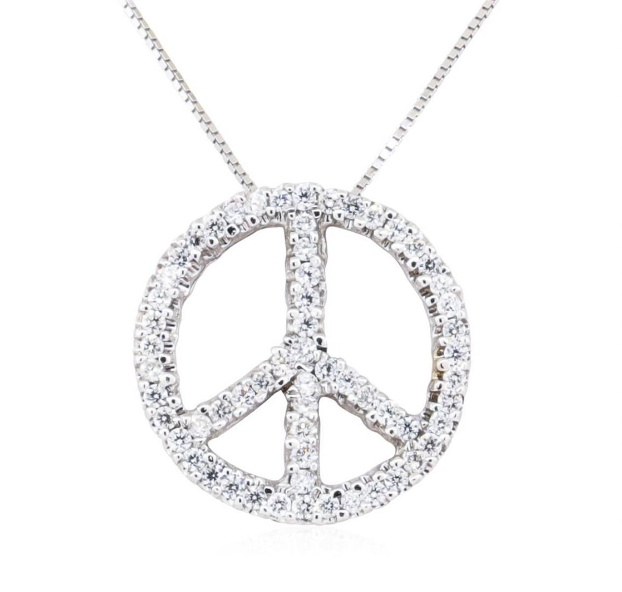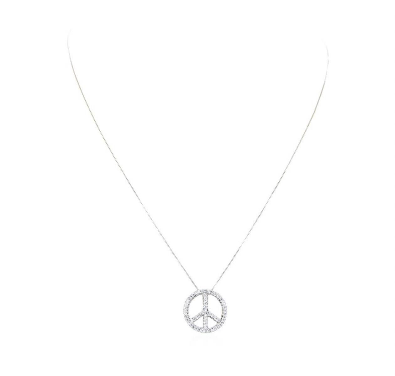 One peace sign pendant with an attached 0.70mm box chain measuring eighteen inches in length featuring: 14KT white gold weighing 2.9 grams containing diamonds weighing 0.80ctw.