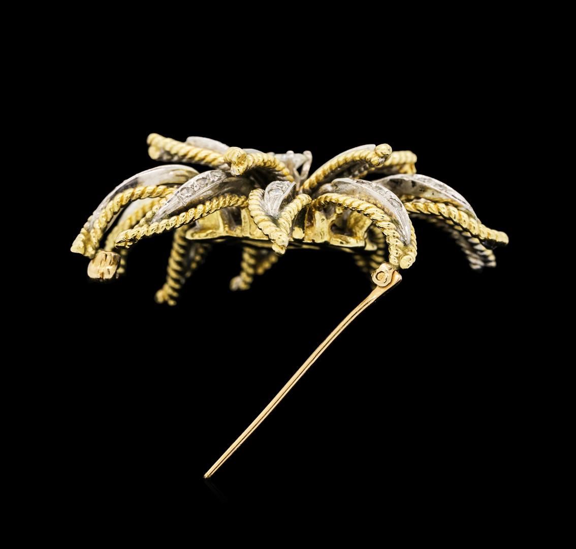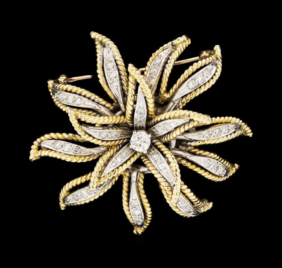 One electronically tested 14KT yellow and white gold lady's combination cast & assembled fashion floral design pin with a bright polish finish. Identified with markings of '14K'. Condition is used, good workmanship. Containing: One prong set round brilliant cut diamond, measuring 4.00 - 3.95 x 2.47mm (depth est.) approximate weight of 0.24ct. Graded in the setting. Color I - J Clarity I-1 Cut Good Forty bead set single cut diamonds, measuring 1.70 - 1.40 x 0.96mm (depth est.) approximate total weight of 40 Stones = 0.56ct. Graded in the setting. Color H - I Clarity SI-1 to I-1 Cut Good. Total Weight of Diamonds 0.80ct.. Total Weight of Pin 20.30gm GAS Appraised at $4,135.00.