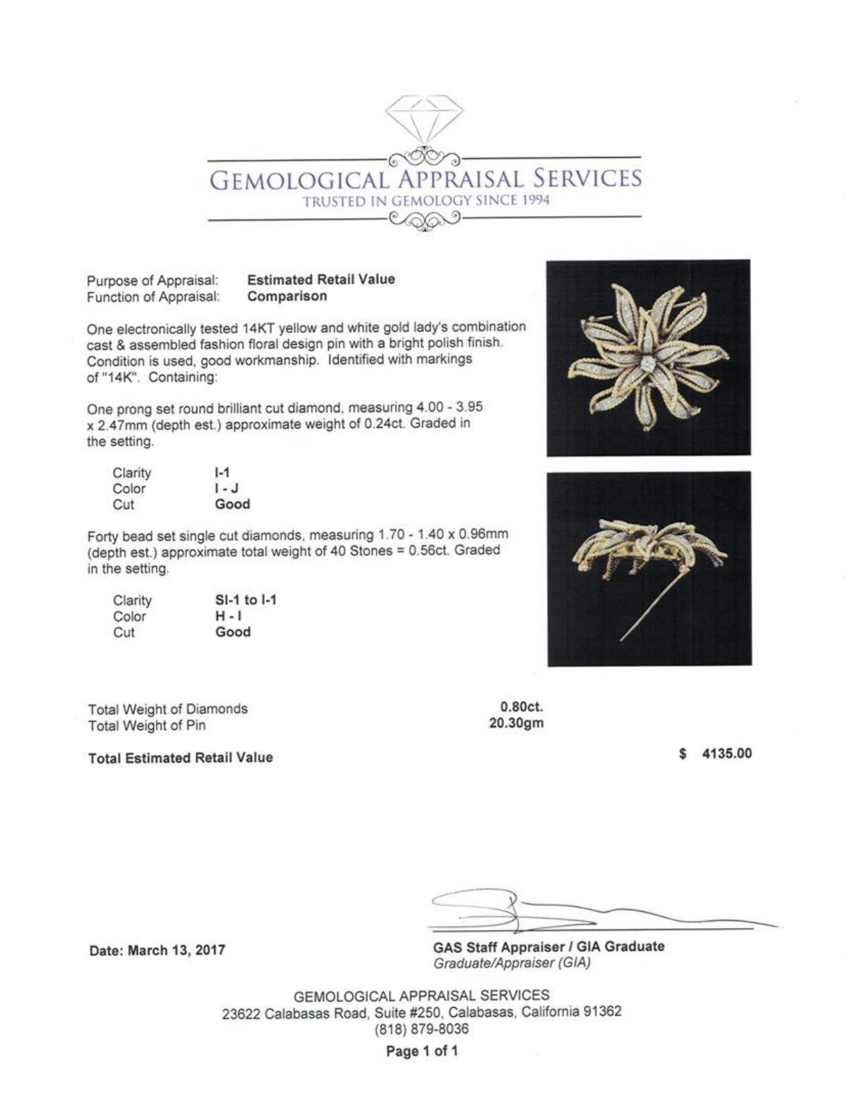 One electronically tested 14KT yellow and white gold lady's combination cast & assembled fashion floral design pin with a bright polish finish. Identified with markings of '14K'. Condition is used, good workmanship. Containing: One prong set round brilliant cut diamond, measuring 4.00 - 3.95 x 2.47mm (depth est.) approximate weight of 0.24ct. Graded in the setting. Color I - J Clarity I-1 Cut Good Forty bead set single cut diamonds, measuring 1.70 - 1.40 x 0.96mm (depth est.) approximate total weight of 40 Stones = 0.56ct. Graded in the setting. Color H - I Clarity SI-1 to I-1 Cut Good. Total Weight of Diamonds 0.80ct.. Total Weight of Pin 20.30gm GAS Appraised.