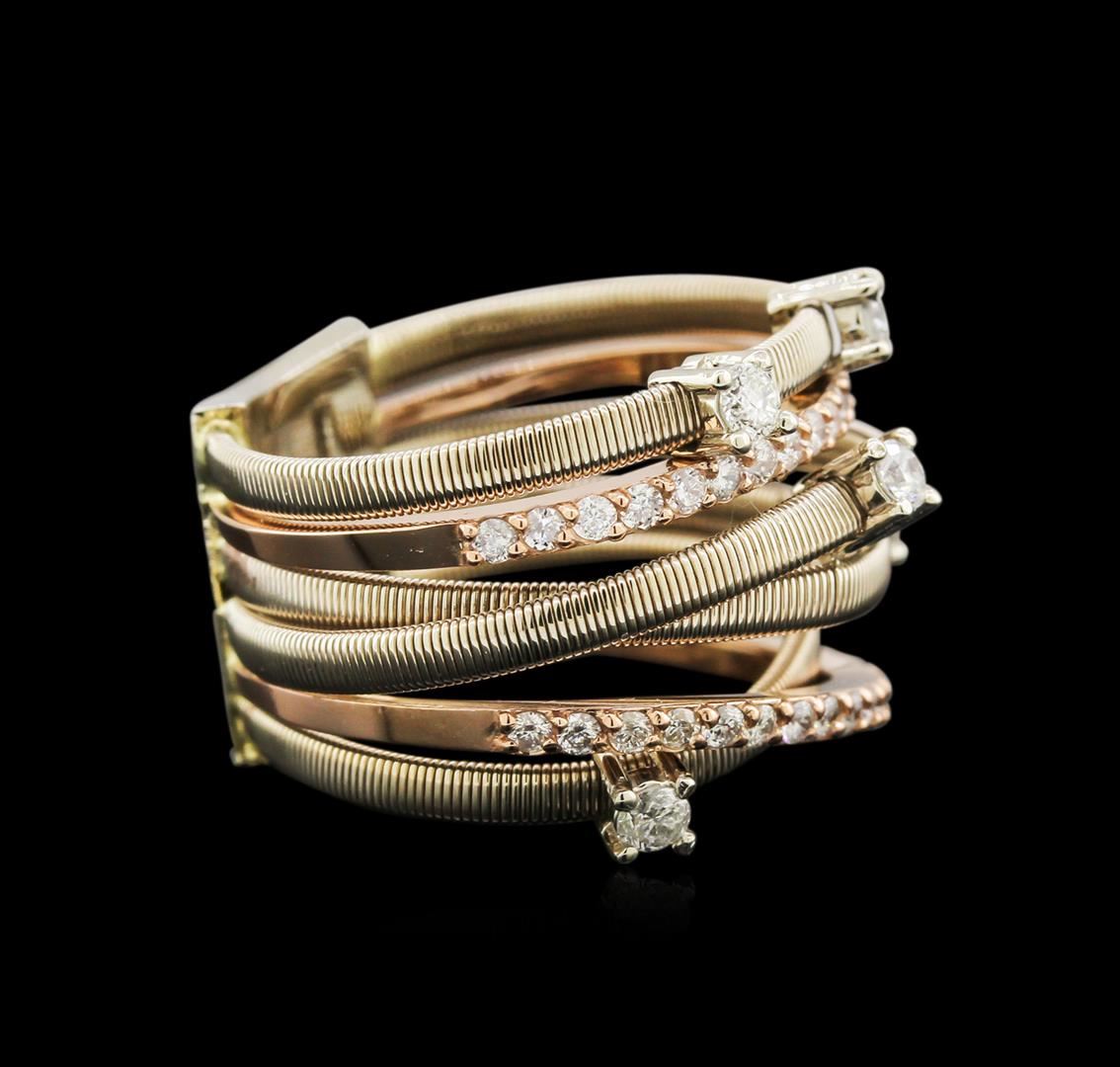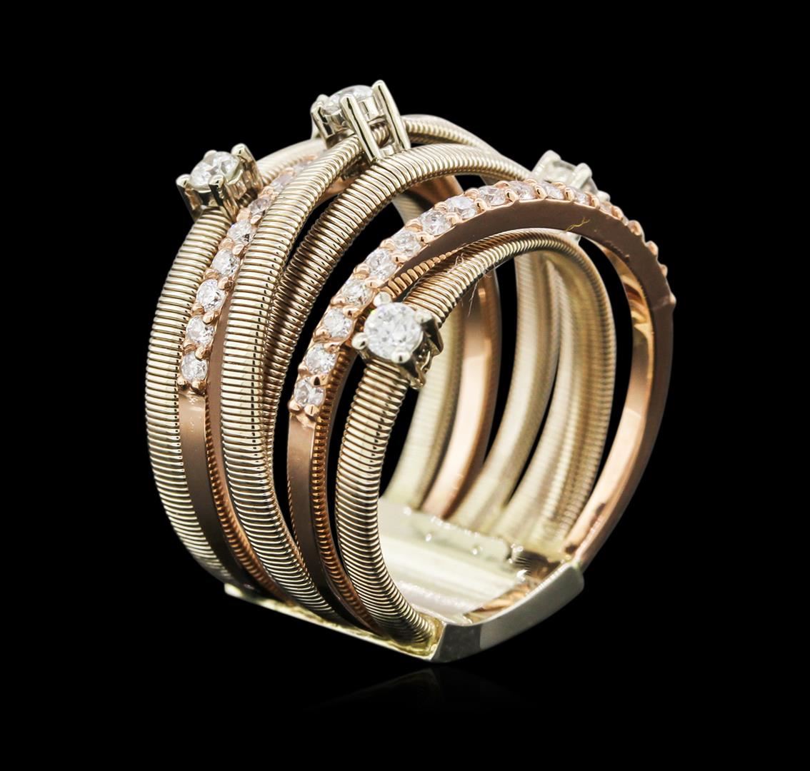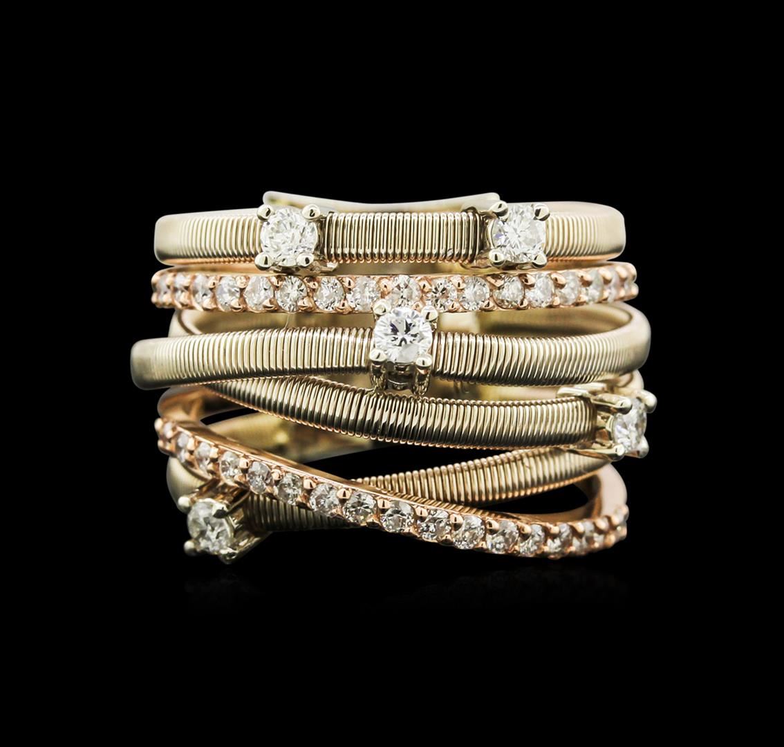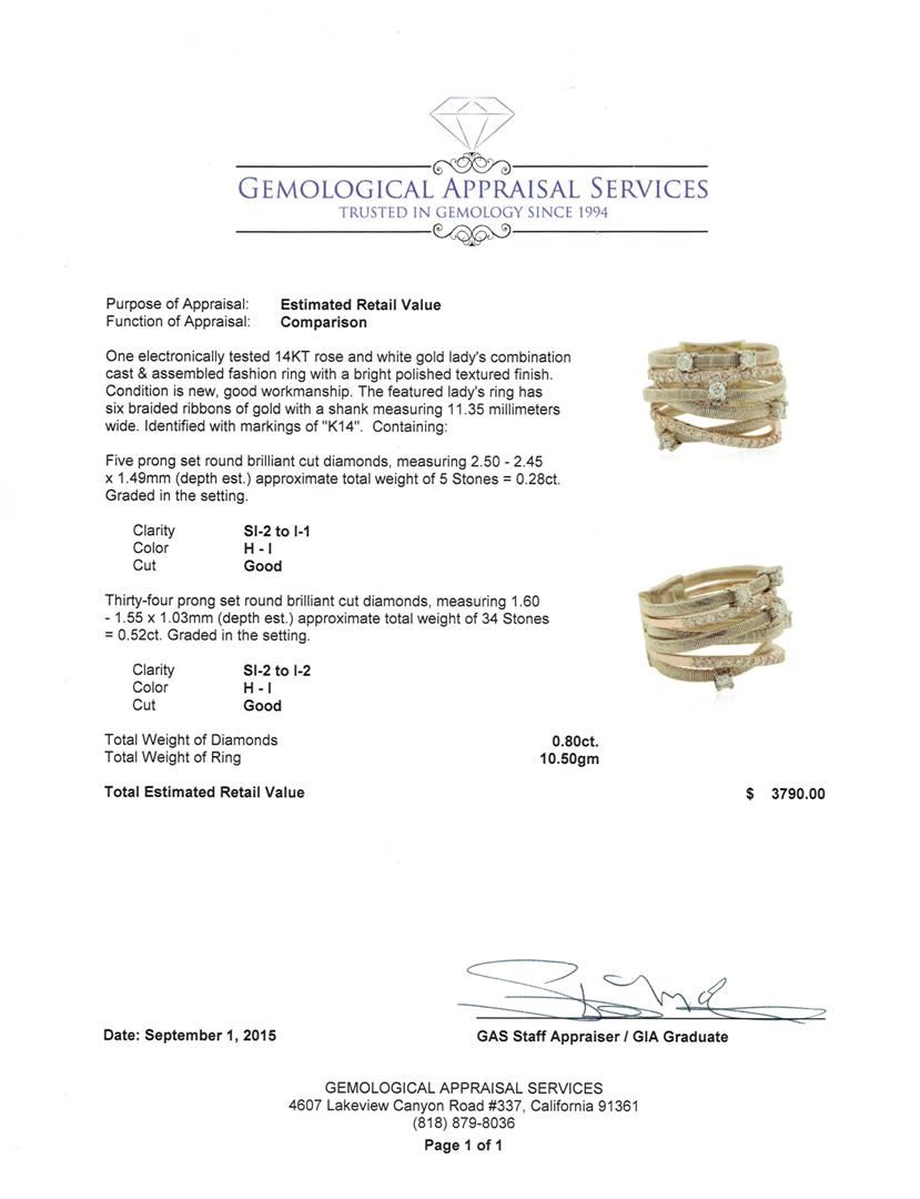 One electronically tested 14KT rose and white gold lady's combination cast & assembled fashion ring with a bright polished textured finish. The featured lady's ring has six braided ribbons of gold with a shank measuring 11.35 millimeters wide. Identified with markings of "K14". Condition is new, good workmanship. Containing: Five prong set round brilliant cut diamonds, measuring 2.50 - 2.45 x 1.49mm (depth est.) approximate total weight of 5 Stones = 0.28ct. Graded in the setting. Clarity: SI-2 to I-1. Color: H - I. Cut Good Thirty-Four prong set round brilliant cut diamonds, measuring 1.60 - 1.55 x 1.03mm (depth est.) approximate total weight of 34 Stones = 0.52ct. Graded in the setting. Clarity: SI-2 to I-2. Color: H - I. Cut Good. Total Weight of Diamonds 0.80ct. Total Weight of Ring 10.50gm. GAS Appraised at $3,790.00.