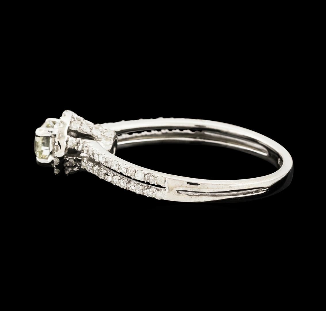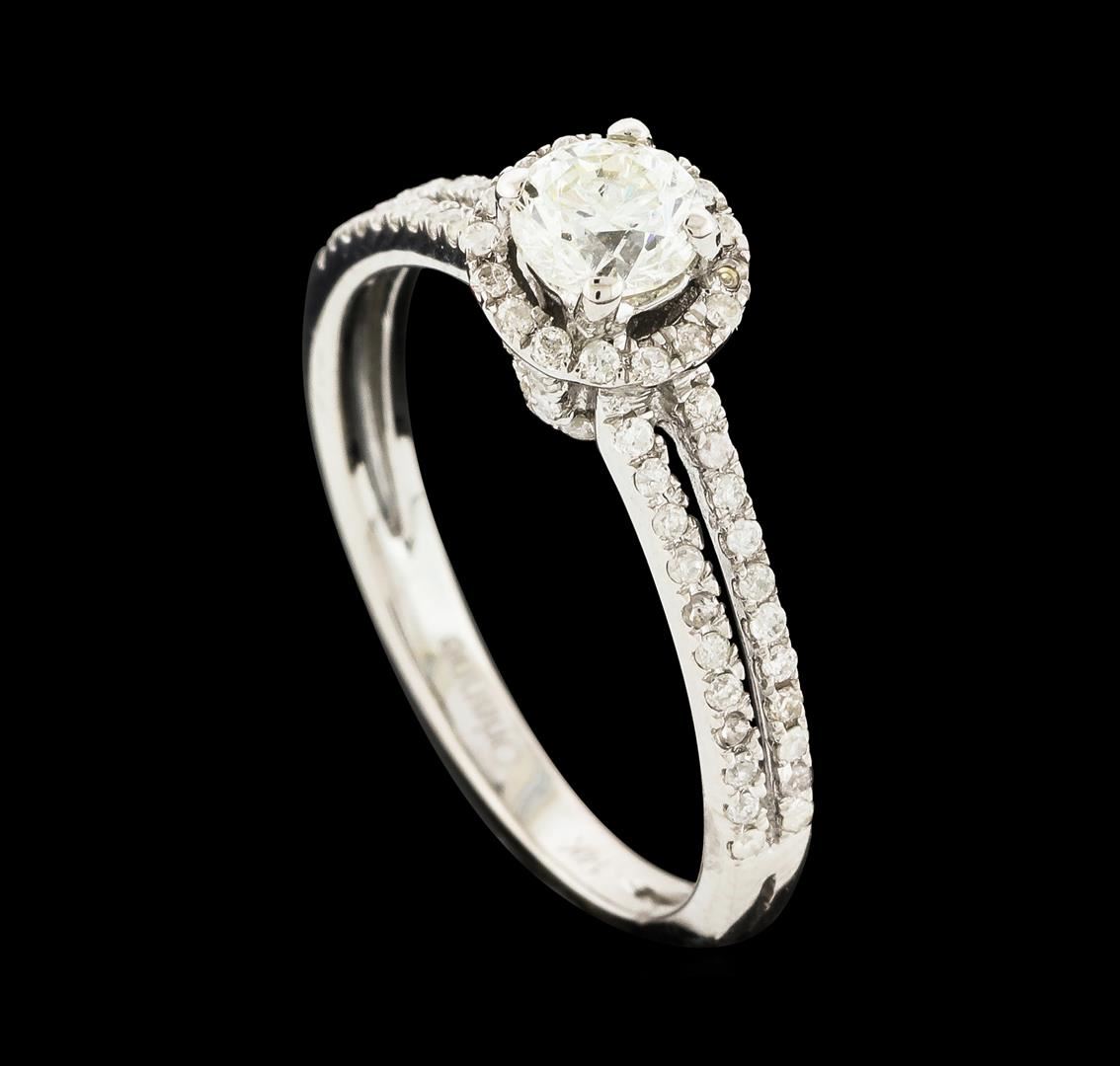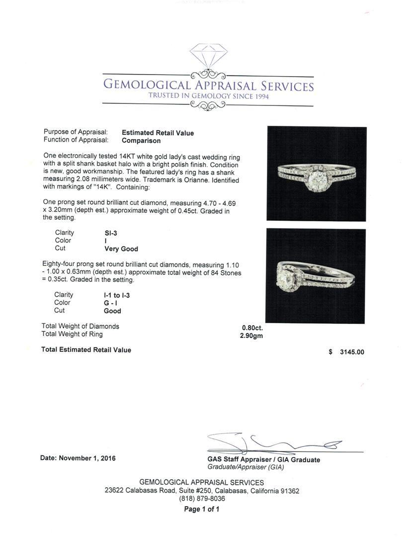 One electronically tested 14KT white gold lady's cast wedding ring with a split shank basket halo with a bright polish finish. The featured lady's ring has a shank measuring 2.08 millimeters wide. Trademark is Orianne. Identified with markings of '14K'. Condition is new, good workmanship. Containing: One prong set round brilliant cut diamond, measuring 4.70 - 4.69 x 3.20mm (depth est.) approximate weight of 0.45ct. Graded in the setting. Clarity SI-3. Color: I Cut Very Good Eighty-Four prong set round brilliant cut diamonds, measuring 1.10 - 1.00 x 0.63mm (depth est.) approximate total weight of 84 Stones = 0.35ct. Graded in the setting. Clarity I-1 to I-3. Color: G - I Cut Good. Total Weight of Diamonds 0.80ct.. Total Weight of Ring 2.90gm. GAS Appraised at $3,145.00.