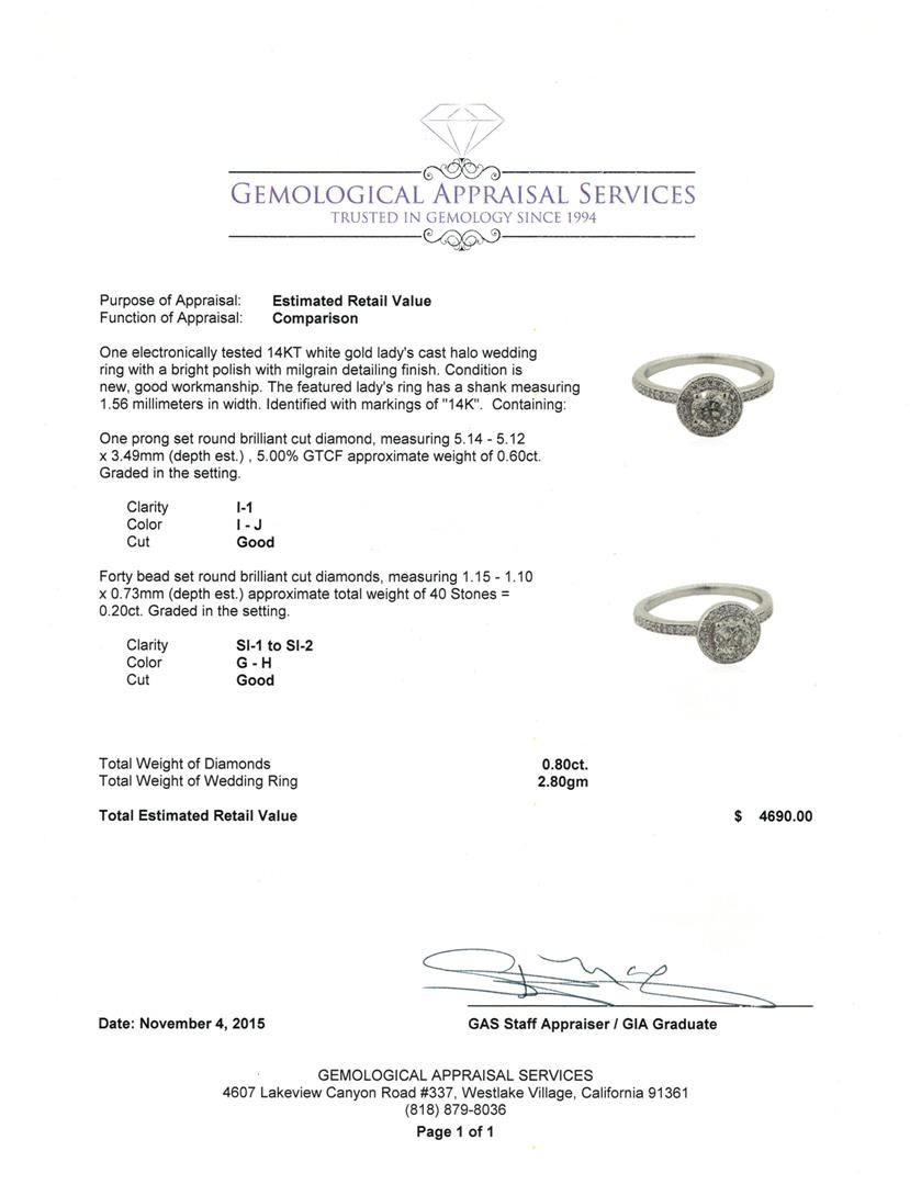One electronically tested 14KT white gold lady's cast halo wedding ring with a bright polish with milgrain detailing finish. The featured lady's ring has a shank measuring 1.56 millimeters in width. Identified with markings of "14K". Condition is new, good workmanship. Containing: One prong set round brilliant cut diamond, measuring 5.14 - 5.12 x 3.49mm (depth est.) , 5.00% GTCF approximate weight of 0.60ct. Graded in the setting. Clarity: I-1. Color: I - Good Forty bead set round brilliant cut diamonds, measuring 1.15 - 1.10 x 0.73mm (depth est.) approximate total weight of 40 Stones = 0.20ct. Graded in the setting. Clarity: SI-1 to SI-2. Color: G - Good. Total Weight of Diamonds 0.80ct. Total Weight of Wedding Ring 2.80gm GAS Appraised at $4,690.00.