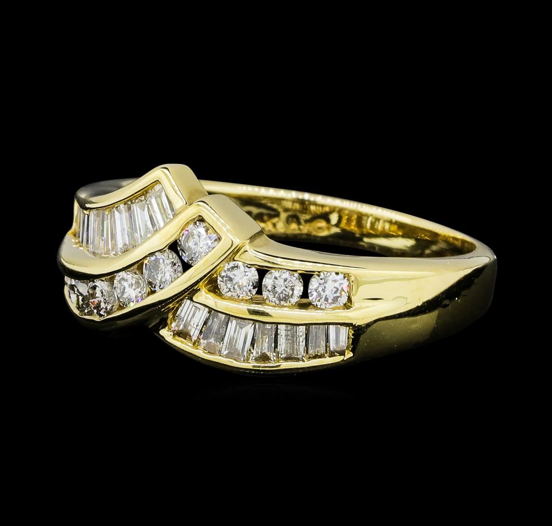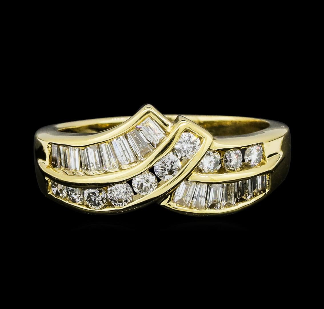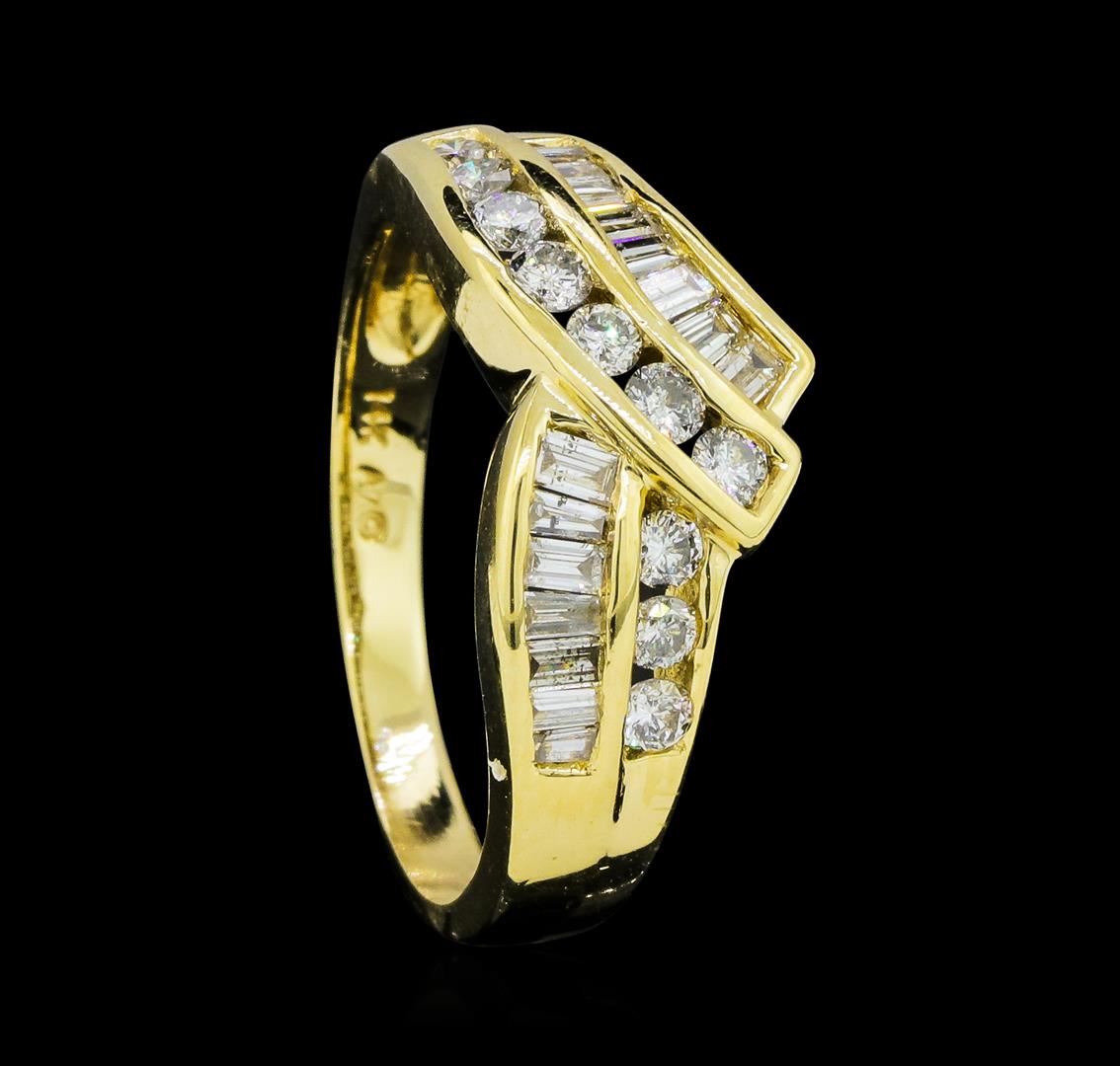 One electronically tested 14KT yellow gold lady's cast fashion chevron ring with a tapered shank with a bright polish finish. The featured lady's ring has a shank measuring 2.32 millimeters wide. Identified with markings of '14K'. Condition is new, good workmanship. Containing: Ten channel set round brilliant cut diamonds, measuring 2.40 - 2.00 x 1.36mm (depth est.) approximate total weight of 10 Stones = 0.40ct. Graded in the setting. Color H - I Clarity SI-1 to SI-2 Cut Good Sixteen channel set baguette cut (tapered) diamonds, measuring from 1.90 x 1.10 x 0.94mm (depth est.) to 2.70 x 1.20 x 1.02mm (depth est.) approximate total weight of 16 Stones = 0.40ct. Graded in the setting. Color H - J Clarity SI-1 to SI-2 Cut Good. Total Weight of Diamonds 0.80ct.. Total Weight of Ring 3.70gm GAS Appraised at $2445.00. GAS Appraised at $2,445.00.