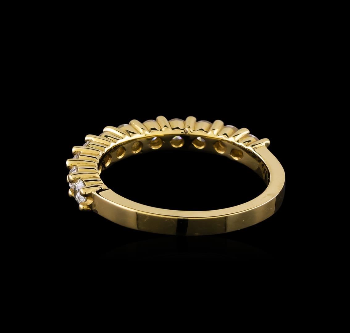One electronically tested 14KT yellow gold lady's cast wedding ring with a straight line with a bright polish finish. The featured lady's ring has a shank measuring 2.14 millimeters in width. Identified with markings of '14K'. Condition is new, good workmanship. Containing: Eleven prong set round brilliant cut diamonds, measuring 2.70 - 2.65 x 1.66mm (depth est.) approximate total weight of 11 Stones = 0.80ct. Graded in the setting. Clarity VS-1 to VS-2. Color: H - I Cut Very Good. Total Weight of Diamonds 0.80ct.. Total Weight of Ring 3.50gm. GAS Appraised at $2,960.00.