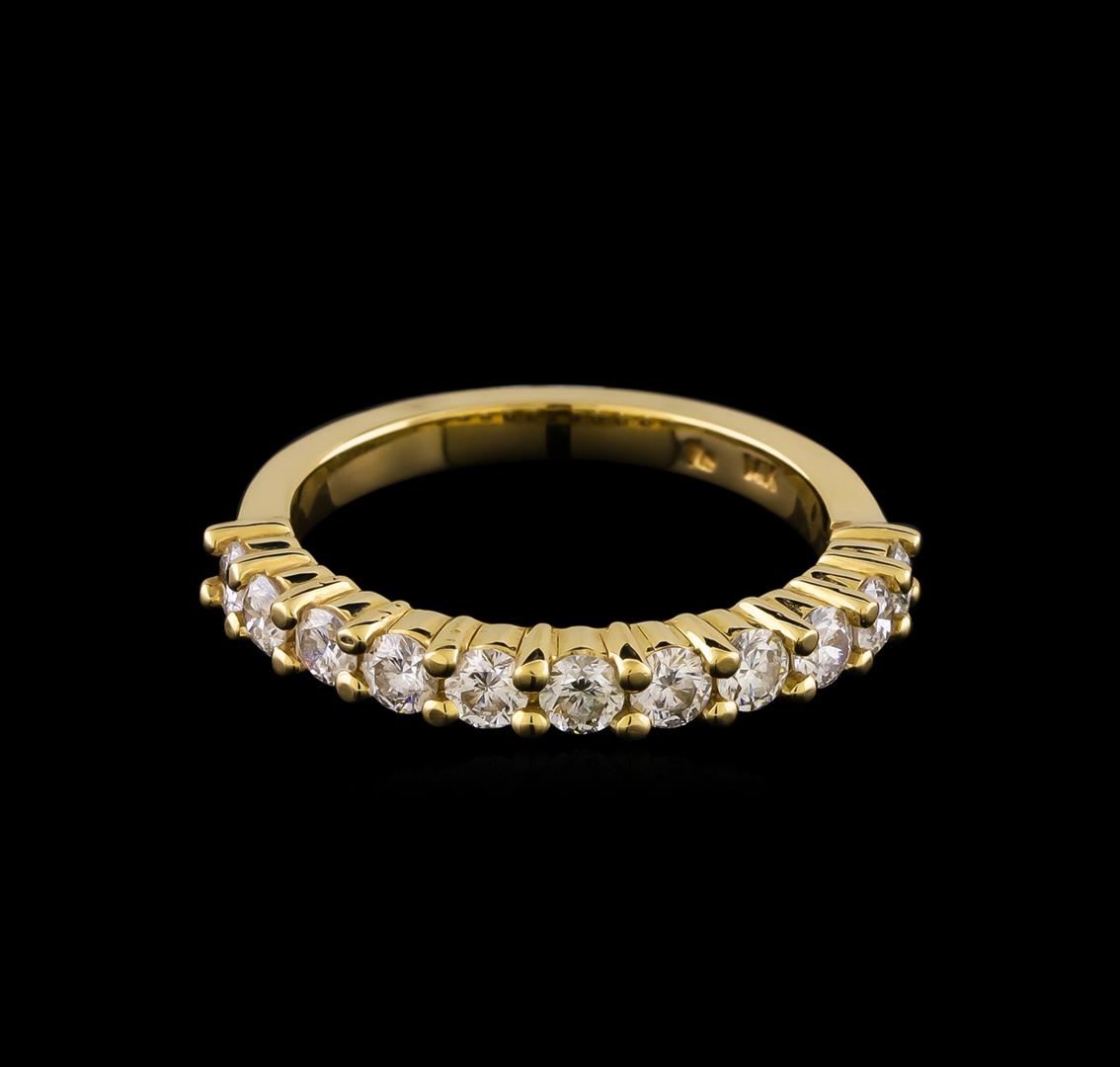 One electronically tested 14KT yellow gold lady's cast wedding ring with a straight line with a bright polish finish. The featured lady's ring has a shank measuring 2.14 millimeters in width. Identified with markings of '14K'. Condition is new, good workmanship. Containing: Eleven prong set round brilliant cut diamonds, measuring 2.70 - 2.65 x 1.66mm (depth est.) approximate total weight of 11 Stones = 0.80ct. Graded in the setting. Clarity VS-1 to VS-2. Color: H - I Cut Very Good. Total Weight of Diamonds 0.80ct.. Total Weight of Ring 3.50gm. GAS Appraised at $2,960.00.