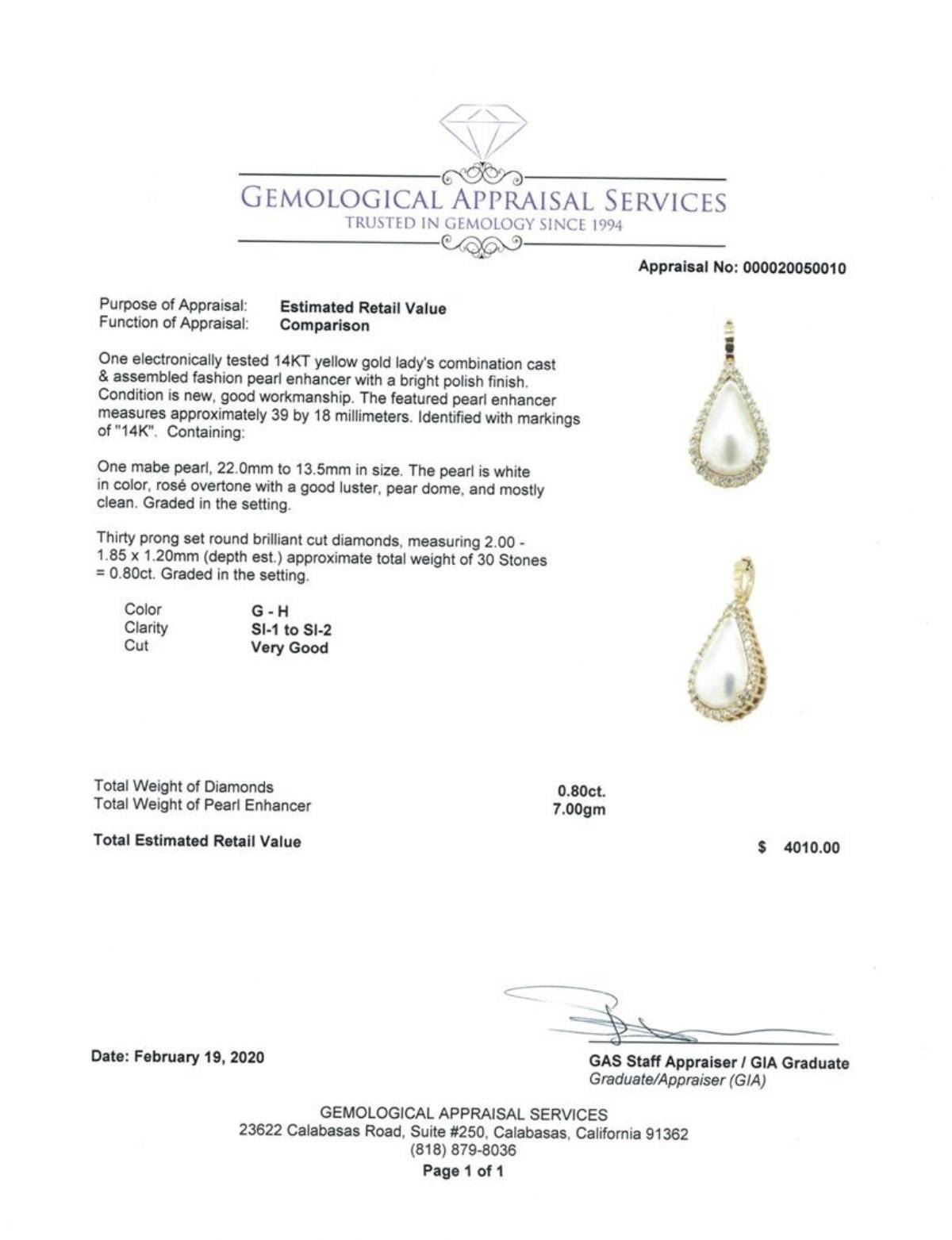 One electronically tested 14KT yellow gold lady's combination cast & assembled fashion pearl enhancer with a bright polish finish. The featured pearl enhancer measures approximately 39 by 18 millimeters. Identified with markings of '14K'. Condition is new, good workmanship. Containing: One mabe pearl, 22.0mm to 13.5mm in size. The pearl is white in color, ros� overtone with a good luster, pear dome, and mostly clean. Graded in the setting. Thirty prong set round brilliant cut diamonds, measuring 2.00 - 1.85 x 1.20mm (depth est.) approximate total weight of 30 Stones = 0.80ct. Graded in the setting. Color G - H Clarity SI-1 to SI-2 Cut Very Good. Total Weight of Diamonds 0.80ct.. Total Weight of Pearl Enhancer 7.00gm GAS Appraised at  $4010.00. GAS Appraised.