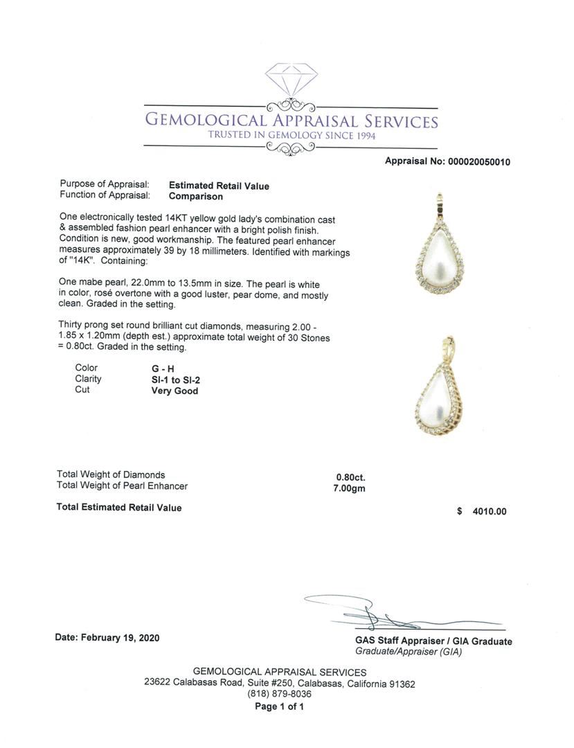 One electronically tested 14KT yellow gold lady's combination cast & assembled fashion pearl enhancer with a bright polish finish. The featured pearl enhancer measures approximately 39 by 18 millimeters. Identified with markings of '14K'. Condition is new, good workmanship. Containing: One mabe pearl, 22.0mm to 13.5mm in size. The pearl is white in color, ros� overtone with a good luster, pear dome, and mostly clean. Graded in the setting. Thirty prong set round brilliant cut diamonds, measuring 2.00 - 1.85 x 1.20mm (depth est.) approximate total weight of 30 Stones = 0.80ct. Graded in the setting. Color G - H Clarity SI-1 to SI-2 Cut Very Good. Total Weight of Diamonds 0.80ct.. Total Weight of Pearl Enhancer 7.00gm GAS Appraised at $4010.00. GAS Appraised.