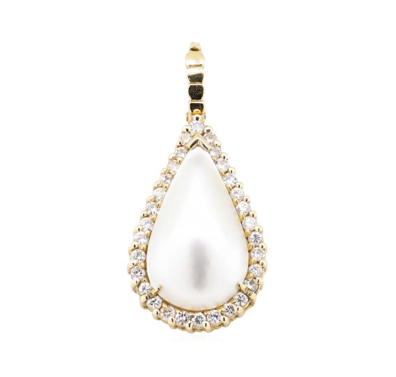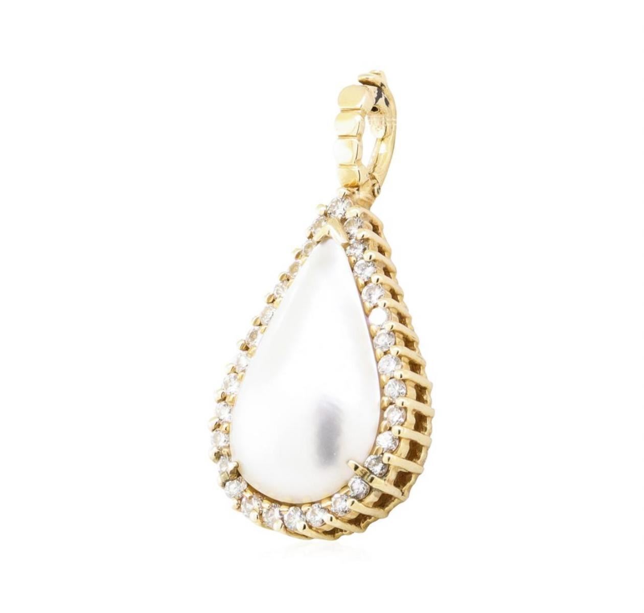 One electronically tested 14KT yellow gold lady's combination cast & assembled fashion pearl enhancer with a bright polish finish. The featured pearl enhancer measures approximately 39 by 18 millimeters. Identified with markings of '14K'. Condition is new, good workmanship. Containing: One mabe pearl, 22.0mm to 13.5mm in size. The pearl is white in color, ros� overtone with a good luster, pear dome, and mostly clean. Graded in the setting. Thirty prong set round brilliant cut diamonds, measuring 2.00 - 1.85 x 1.20mm (depth est.) approximate total weight of 30 Stones = 0.80ct. Graded in the setting. Color G - H Clarity SI-1 to SI-2 Cut Very Good. Total Weight of Diamonds 0.80ct.. Total Weight of Pearl Enhancer 7.00gm GAS Appraised at $4010.00. GAS Appraised.