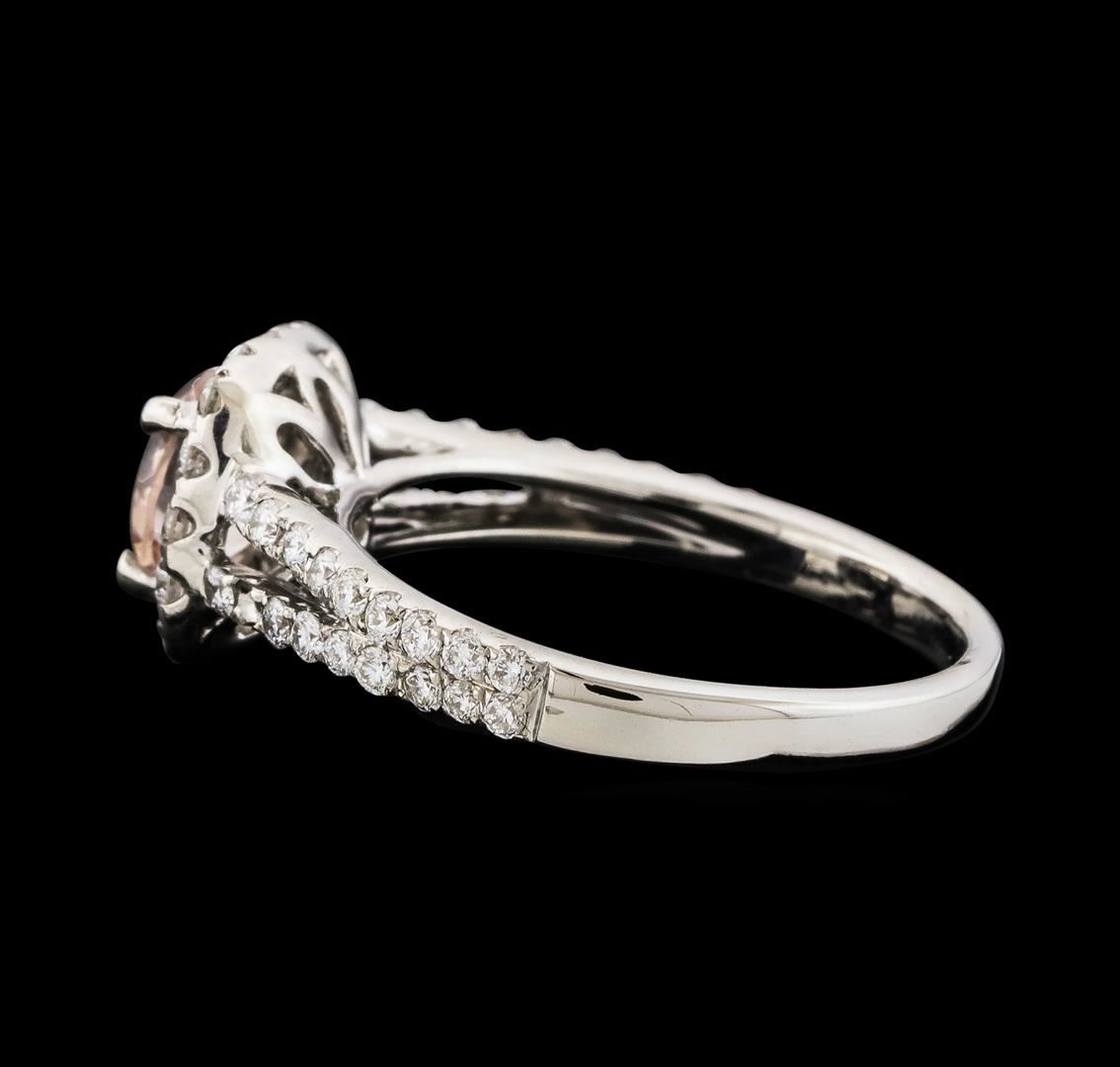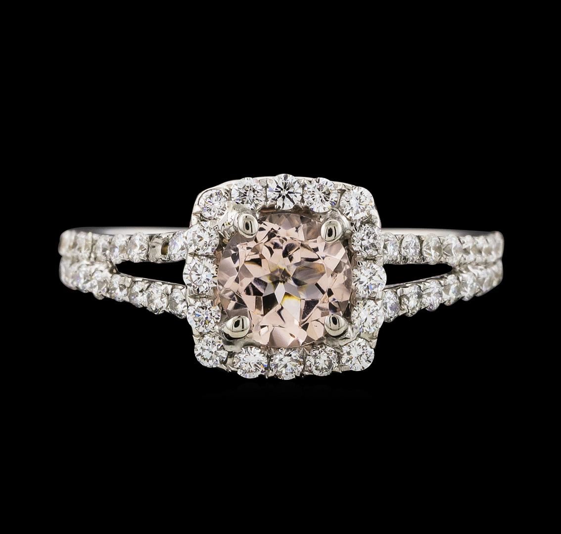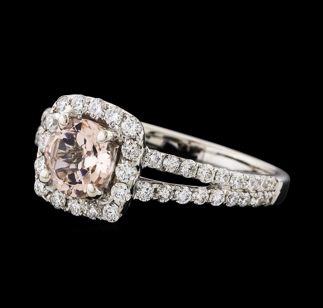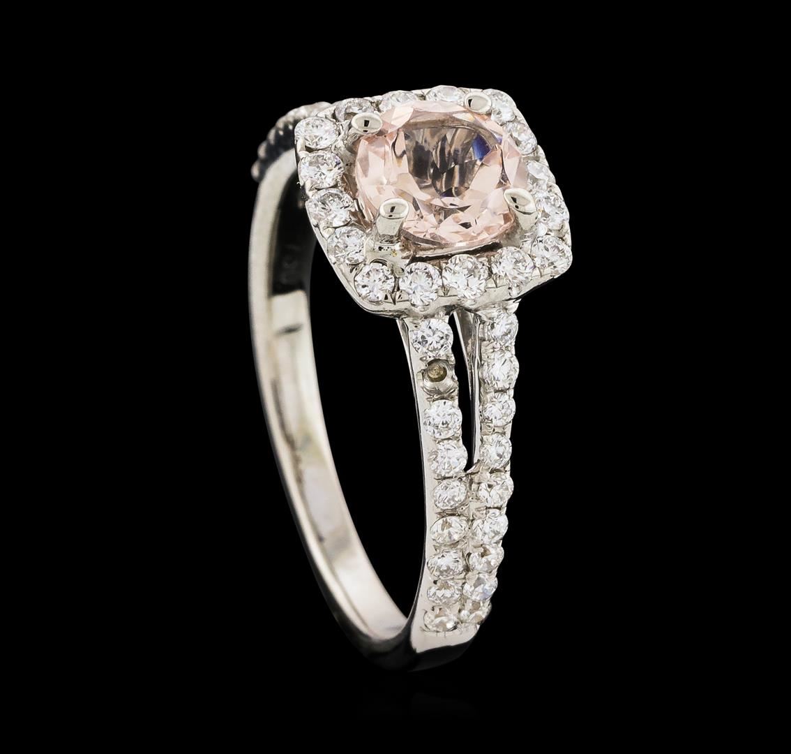 One Morganite and Diamond Ring featuring: 18KT White Gold with a total weight of 3.84 grams, Morganite with a total weight of 0.80ct, and side diamonds with a total weight of 0.76ctw.