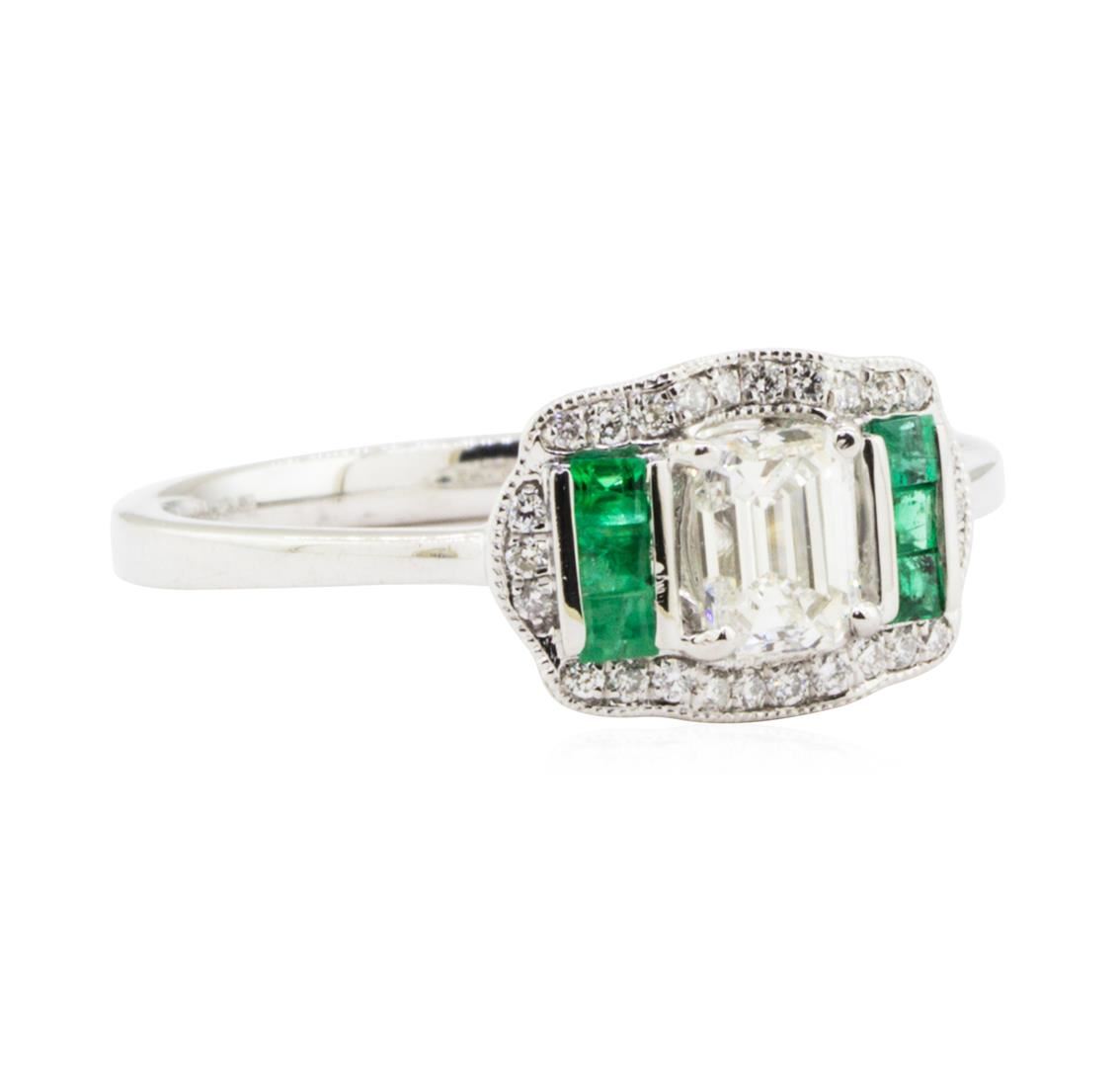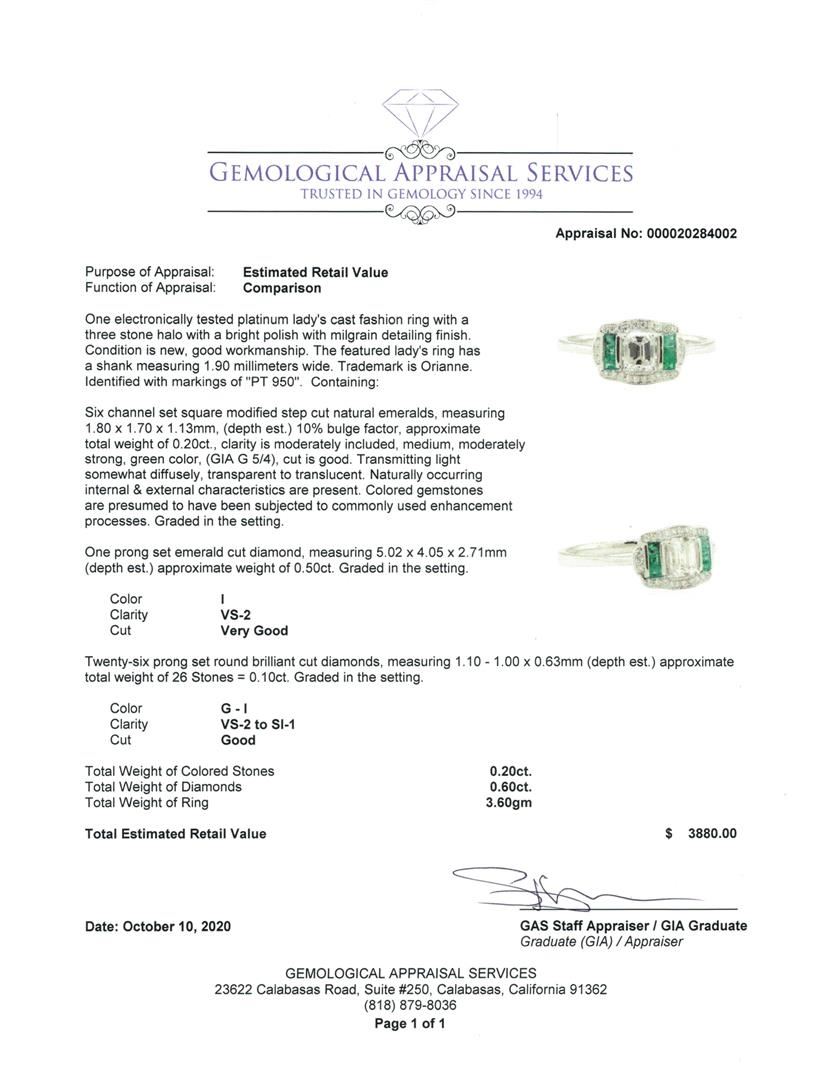 One electronically tested platinum lady's cast fashion ring with a three stone halo with a bright polish with milgrain detailing finish. Condition is new, good workmanship. The featured lady's ring has a shank measuring 1.90 millimeters wide. Trademark is Orianne. Identified with markings of "PT 950". Containing: Six channel set square modified step cut natural emeralds, measuring 1.80 x 1.70 x 1.13mm, (depth est.) 10% bulge factor, approximate total weight of 0.20ct., clarity is moderately included, medium, moderately strong, green color, (GIA G 5/4), cut is good. Transmitting light somewhat diffusely, transparent to translucent. Naturally occurring internal & external characteristics are present. Colored gemstones are presumed to have been subjected to commonly used enhancement processes. Graded in the setting. One prong set emerald cut diamond, measuring 5.02 x 4.05 x 2.71mm (depth est.) approximate weight of 0.50ct. Graded in the setting. Color I Clarity VS-2 Cut Very Good Twenty-six prong set round brilliant cut diamonds, measuring 1.10 - 1.00 x 0.63mm (depth est.) approximate total weight of 26 Stones = 0.10ct. Graded in the setting. Color G - I Clarity VS-2 to SI-1 Cut Good Total Weight of Colored Stones Total Weight of Diamonds Total Weight of Ring Total Estimated Retail Value 0.20ct. 0.60ct. 3.60gm $ 3880.00
