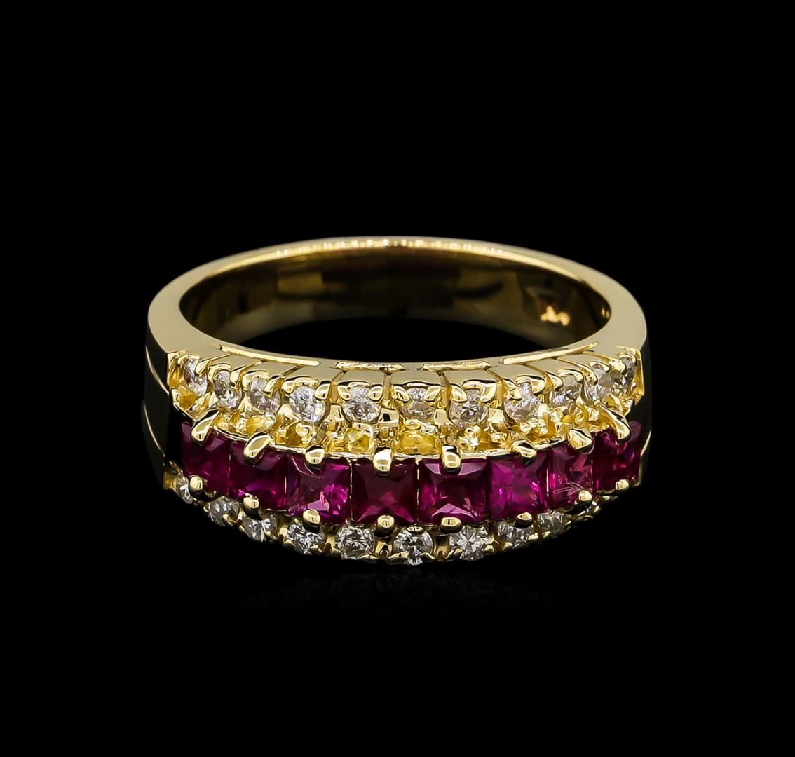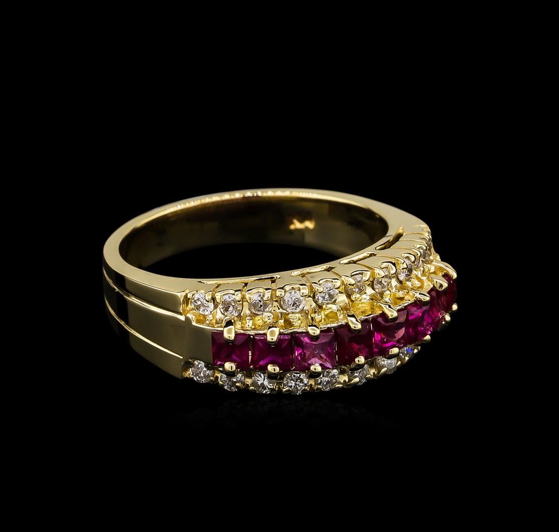 One polished, stamped, and tested 14KT yellow gold ring mounted with: 8 genuine rubies weighing 0.80ct, and 22 genuine round diamonds weighing 0.31ct. This item weighs 5.40 grams, condition is new, very good workmanship. AIGL Appraised at $3,188.00.
