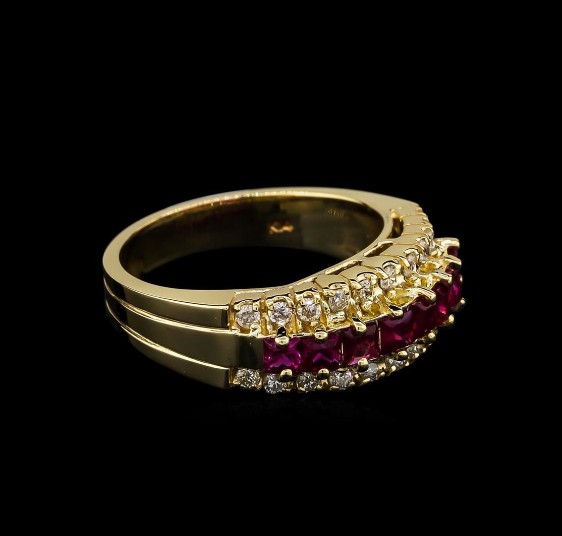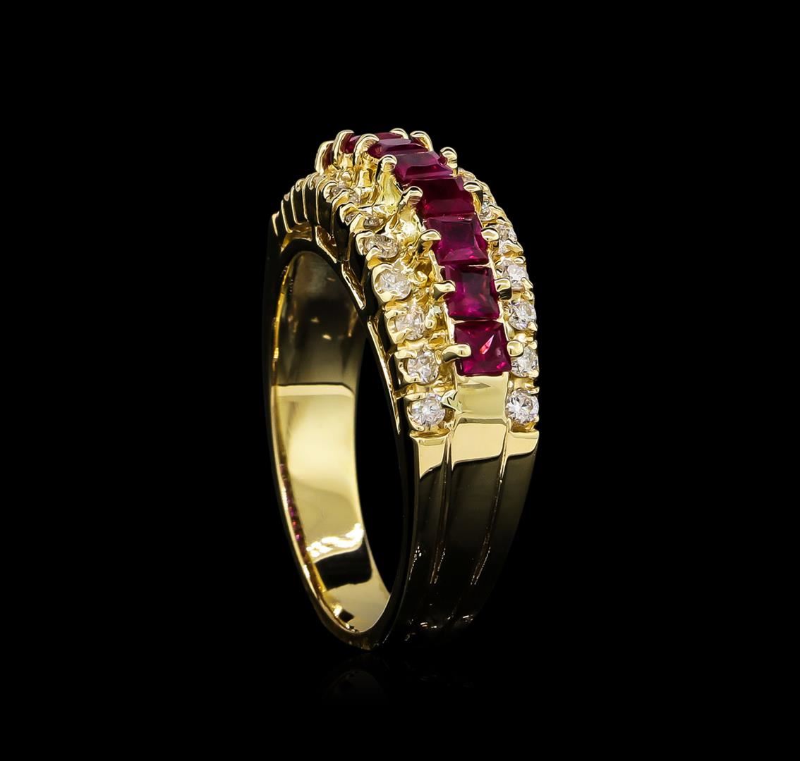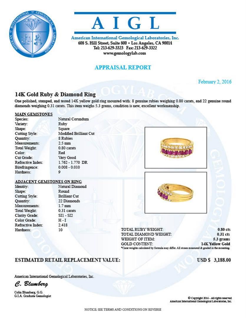 One polished, stamped, and tested 14KT yellow gold ring mounted with: 8 genuine rubies weighing 0.80ct, and 22 genuine round diamonds weighing 0.31ct. This item weighs 5.30 grams, condition is new, very good workmanship. AIGL Appraised at $3,188.00.