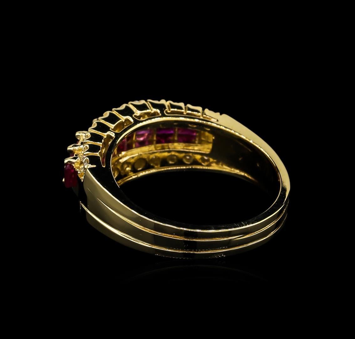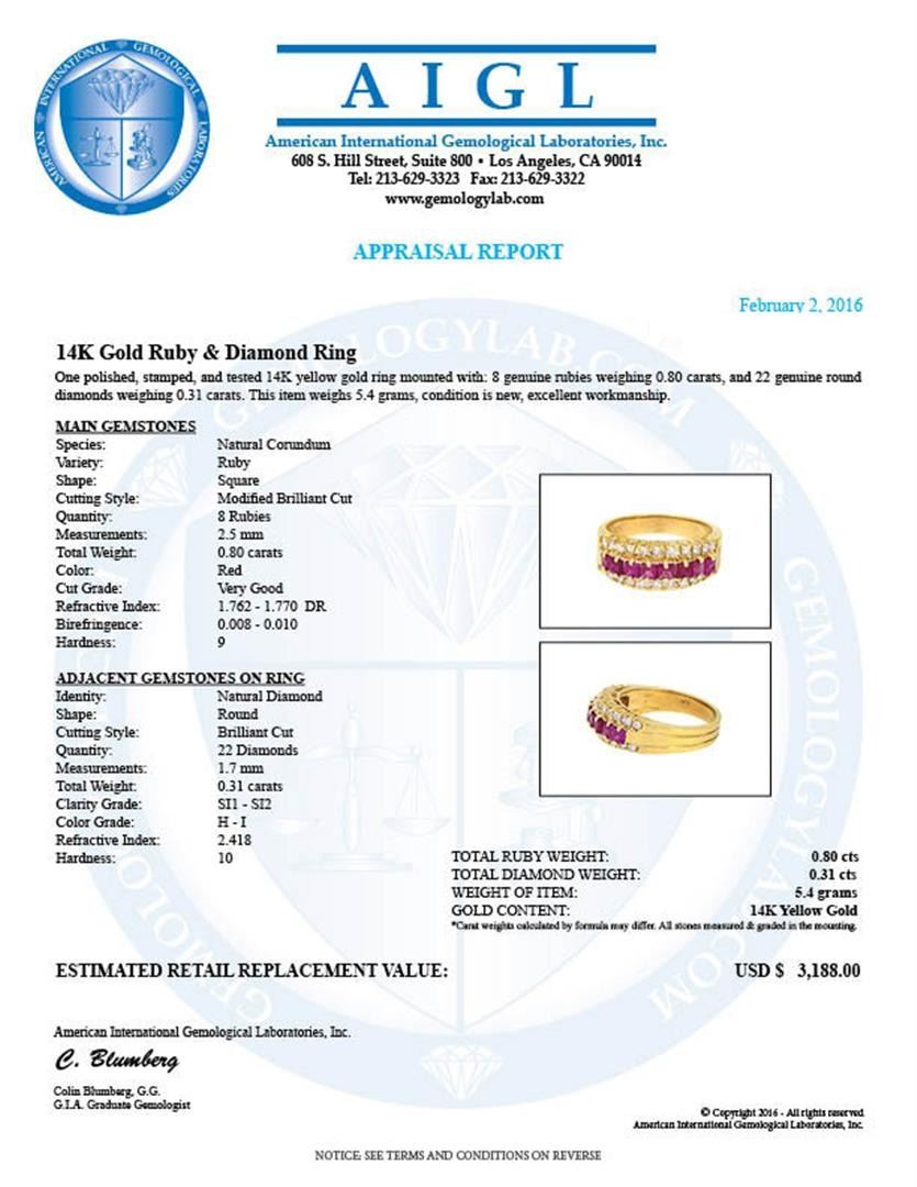 One polished, stamped, and tested 14KT yellow gold ring mounted with: 8 genuine rubies weighing 0.80ct, and 22 genuine round diamonds weighing 0.31ct. This item weighs 5.40 grams, condition is new, very good workmanship. AIGL Appraised at $3,188.00.