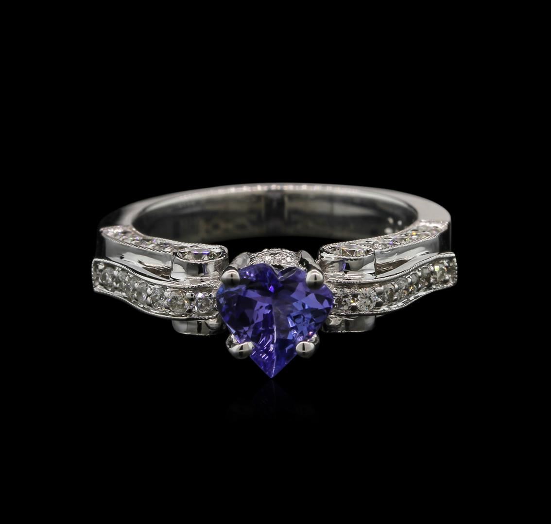 One ring featuring: 14KT white gold weighing 7.54 grams containing one prong set heart shape tanzanite center stone with a total weight of 0.80ct and pave and bezel set round diamonds with a total weight of 0.64ct.