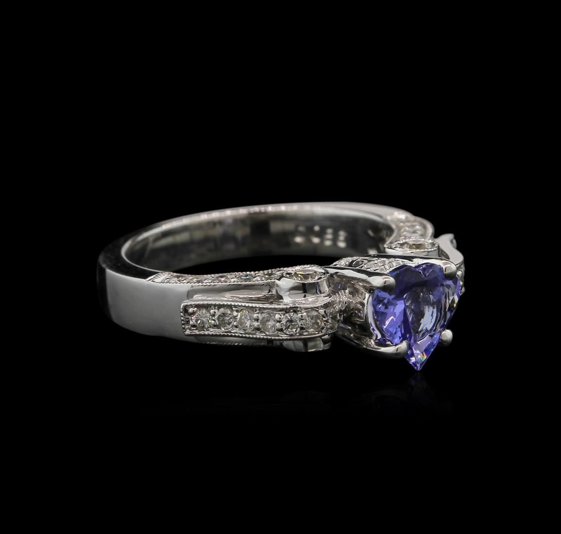 One ring featuring: 14KT white gold weighing 7.54 grams containing one prong set heart shape tanzanite center stone with a total weight of 0.80ct and pave and bezel set round diamonds with a total weight of 0.64ct.