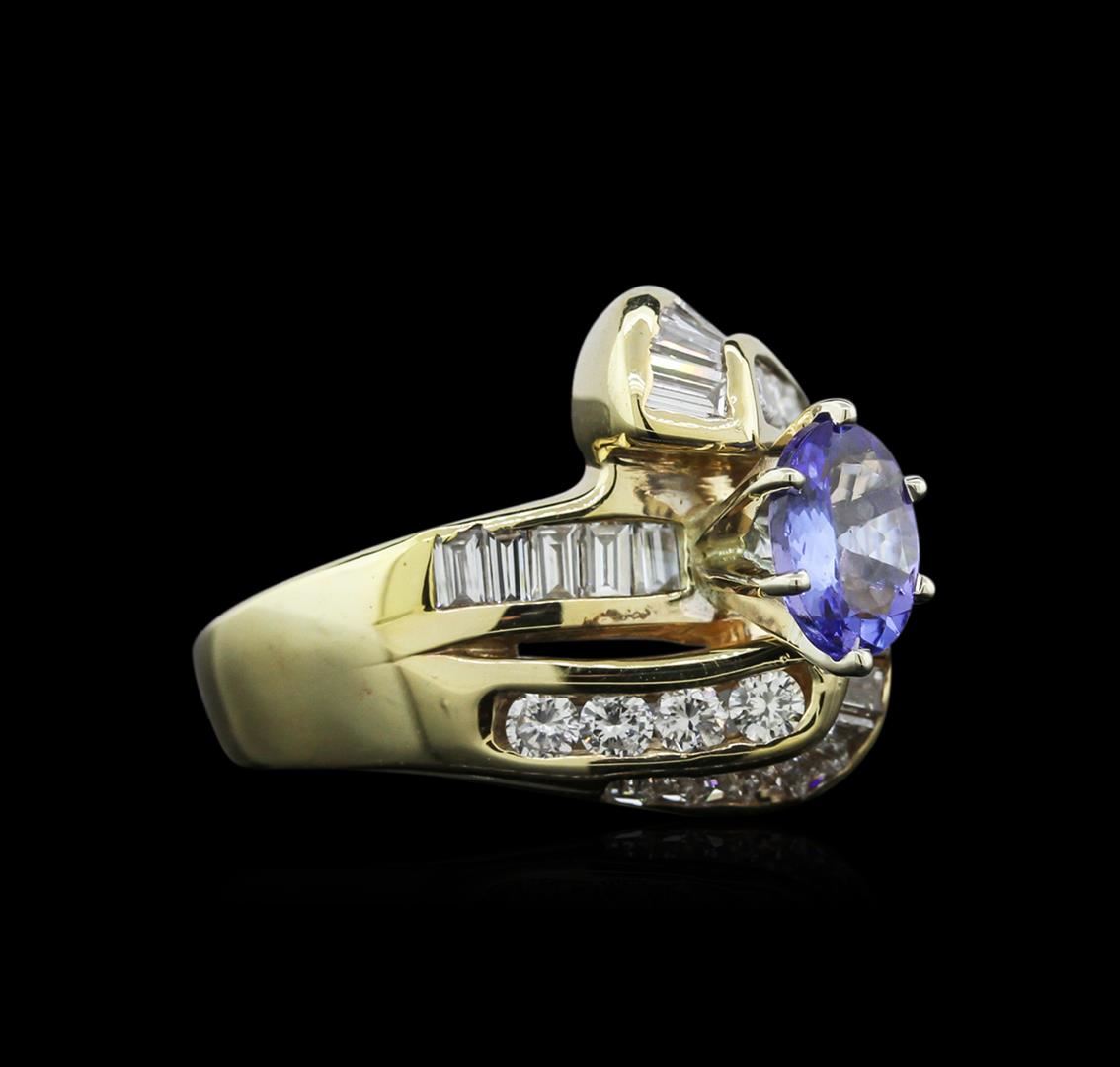 One electronically tested 14KT yellow gold ladies cast tanzanite and diamond ring with a bright polish finish. Identified with markings of "14K". Condition is new. Containing: One prong set oval modified brilliant cut natural tanzanite, measuring 7.00 x 5.00 x 3.25mm, approximate weight of 0.80 ct., clarity is eye clean, type I, medium light, moderately strong, violet color, (GIA V 4/4), cut is good. Twenty-Four channel set baguette cut diamonds, measuring 2.00 x 1.56 x 1.33mm (depth est.) approximate total weight of 24 Stones = 0.88ct. Clarity: VS-2. Color: H - I, Cut is Good. Eight channel set round brilliant cut diamonds, measuring 2.50 - 2.50 x 1.50mm (depth est.) approximate total weight of 8 Stones = 0.46ct. Clarity: SI-1 to SI-2. Color: G - H, Cut is Good. Colored gemstones are presumed to have been subjected to commonly used enhancement processes. All diamonds and colored gemstones are graded in the mounting, unless otherwise stated. Total Weight of Colored Stones 0.80 ct. Total Weight of Diamonds 1.33ct. Total Weight of Ring 6.90gm. GGL Appraised.