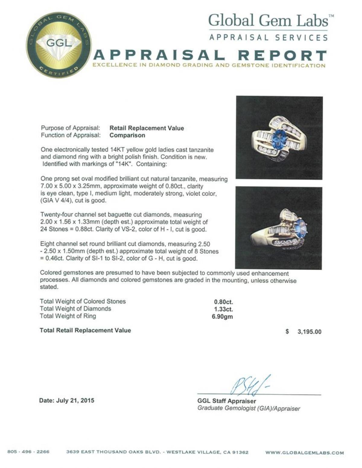 One electronically tested 14KT yellow gold ladies cast tanzanite and diamond ring with a bright polish finish. Identified with markings of "14K". Condition is new. Containing: One prong set oval modified brilliant cut natural tanzanite, measuring 7.00 x 5.00 x 3.25mm, approximate weight of 0.80 ct., clarity is eye clean, type I, medium light, moderately strong, violet color, (GIA V 4/4), cut is good. Twenty-Four channel set baguette cut diamonds, measuring 2.00 x 1.56 x 1.33mm (depth est.) approximate total weight of 24 Stones = 0.88ct. Clarity: VS-2. Color: H - I, Cut is Good. Eight channel set round brilliant cut diamonds, measuring 2.50 - 2.50 x 1.50mm (depth est.) approximate total weight of 8 Stones = 0.46ct. Clarity: SI-1 to SI-2. Color: G - H, Cut is Good. Colored gemstones are presumed to have been subjected to commonly used enhancement processes. All diamonds and colored gemstones are graded in the mounting, unless otherwise stated. Total Weight of Colored Stones 0.80 ct. Total Weight of Diamonds 1.33ct. Total Weight of Ring 6.90gm. GGL Appraised.