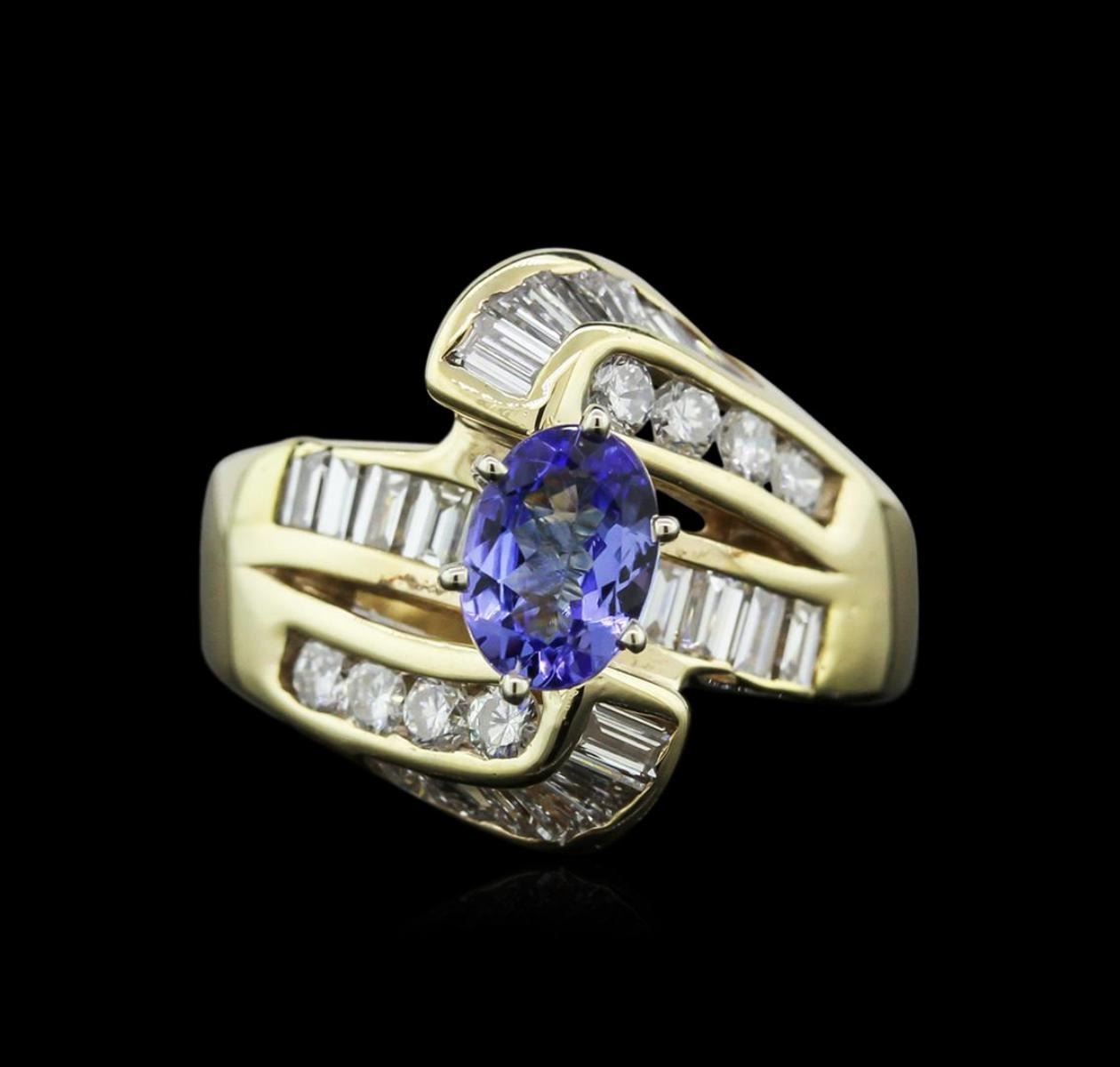 One electronically tested 14KT yellow gold ladies cast tanzanite and diamond ring with a bright polish finish. Identified with markings of "14K". Condition is new. Containing: One prong set oval modified brilliant cut natural tanzanite, measuring 7.00 x 5.00 x 3.25mm, approximate weight of 0.80 ct., clarity is eye clean, type I, medium light, moderately strong, violet color, (GIA V 4/4), cut is good. Twenty-Four channel set baguette cut diamonds, measuring 2.00 x 1.56 x 1.33mm (depth est.) approximate total weight of 24 Stones = 0.88ct. Clarity: VS-2. Color: H - I, Cut is Good. Eight channel set round brilliant cut diamonds, measuring 2.50 - 2.50 x 1.50mm (depth est.) approximate total weight of 8 Stones = 0.46ct. Clarity: SI-1 to SI-2. Color: G - H, Cut is Good. Colored gemstones are presumed to have been subjected to commonly used enhancement processes. All diamonds and colored gemstones are graded in the mounting, unless otherwise stated. Total Weight of Colored Stones 0.80 ct. Total Weight of Diamonds 1.33ct. Total Weight of Ring 6.90gm. GGL Appraised.
