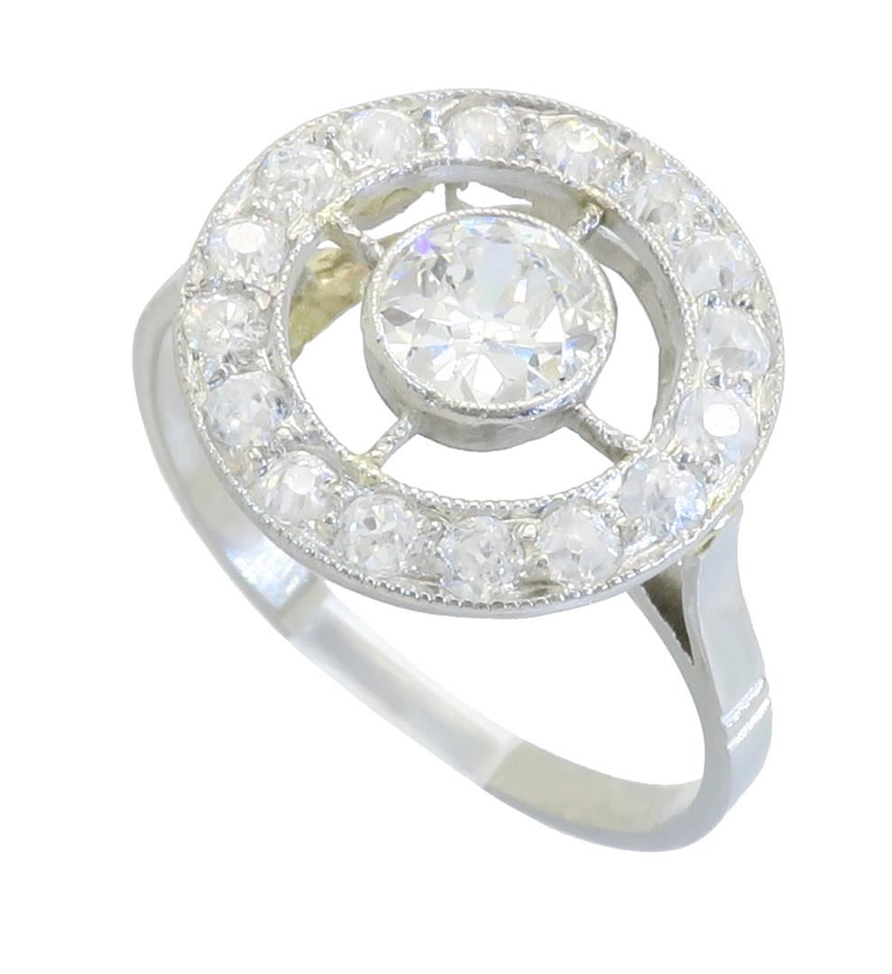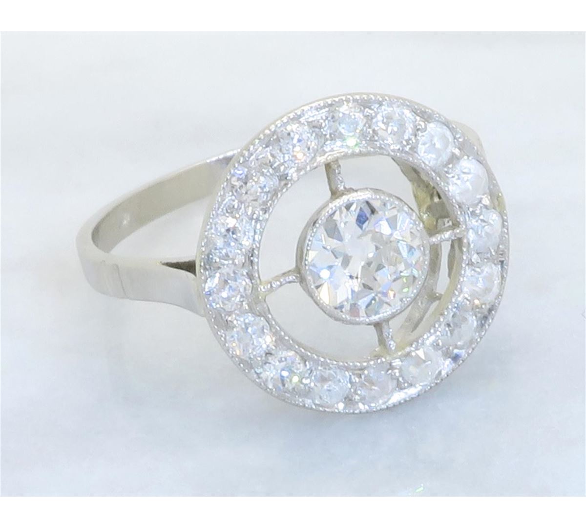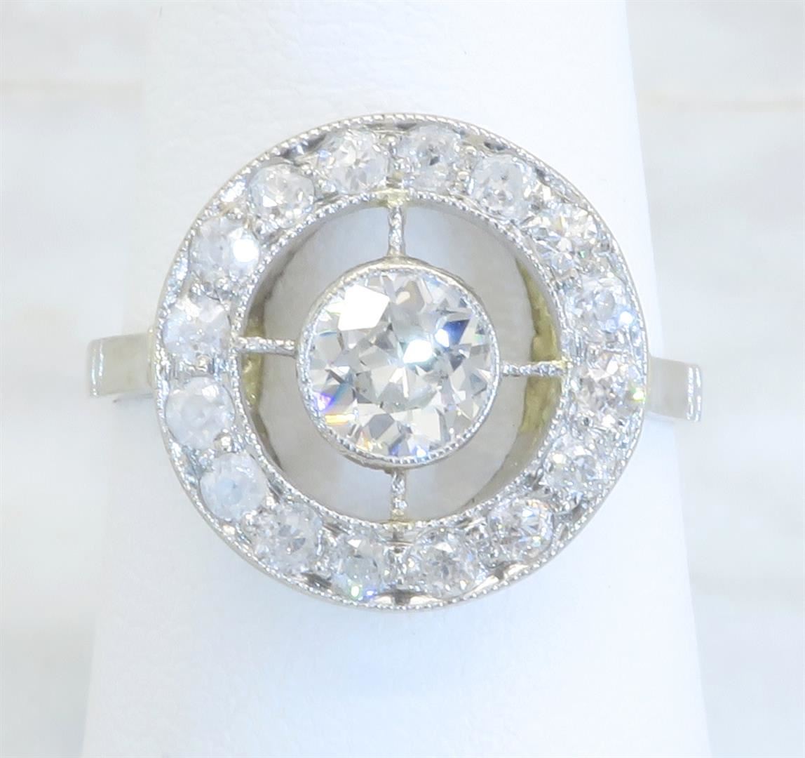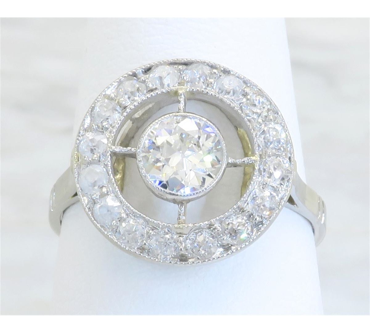 One tested platinum vintage diamond ring. Containing: One Old European Cut Diamond. Approximate size: .38CT. Clarity: SI2, Color: H-I. 16 Old European Cut Diamonds. Approximate total diamond weight: .80CTW. All diamonds are graded in the mounting unless otherwise stated. Weight of ring: 2.8 grams, Size: 5.75