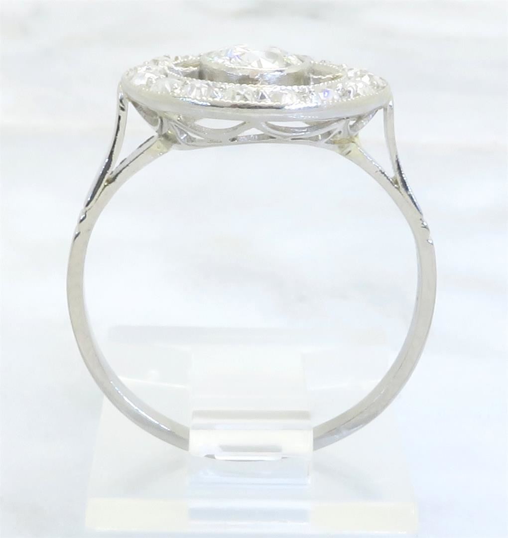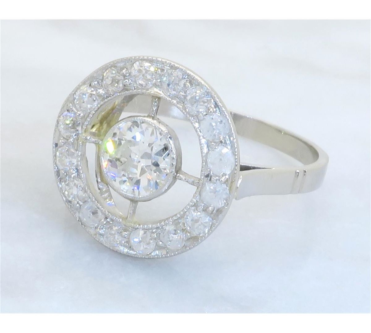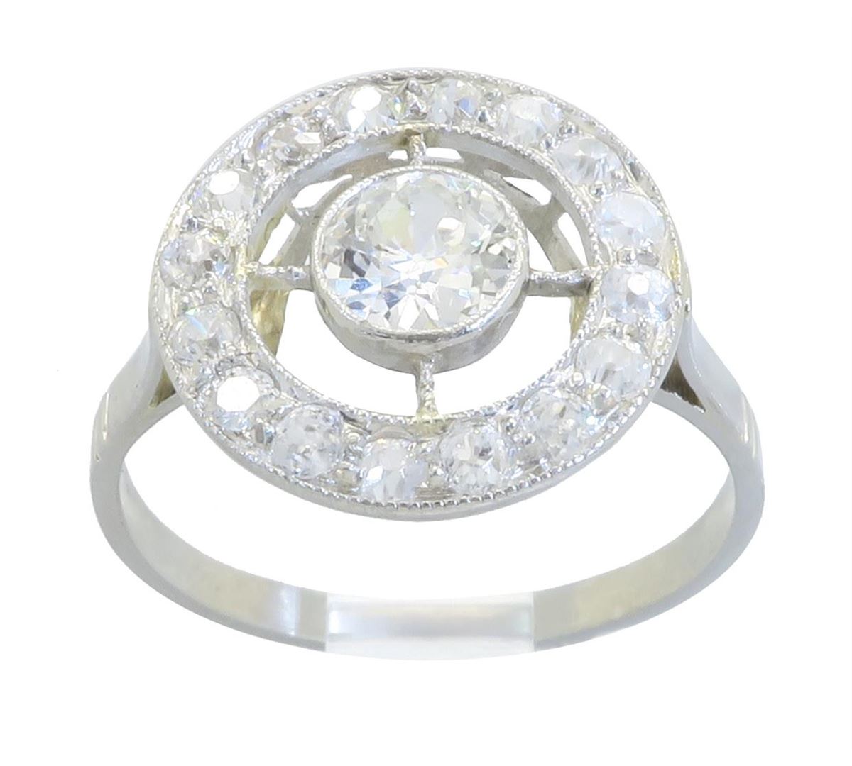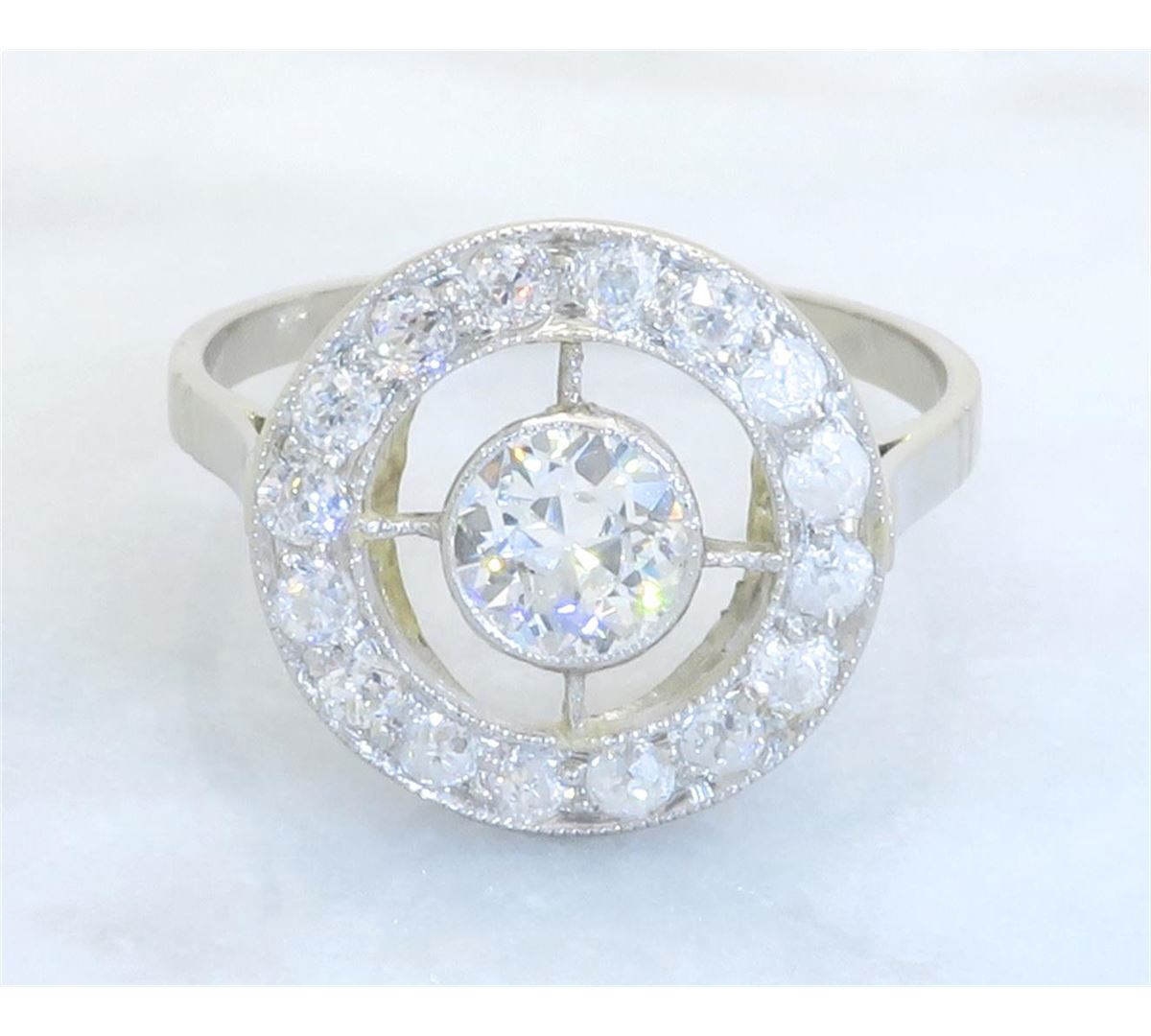 One tested platinum vintage diamond ring. Containing: One Old European Cut Diamond. Approximate size: .38CT. Clarity: SI2, Color: H-I. 16 Old European Cut Diamonds. Approximate total diamond weight: .80CTW. All diamonds are graded in the mounting unless otherwise stated. Weight of ring: 2.8 grams, Size: 5.75