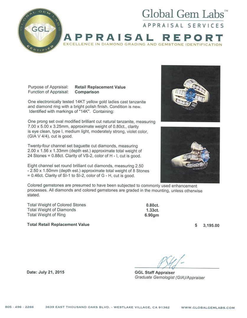 One electronically tested 14KT yellow gold ladies cast tanzanite and diamond ring with a bright polish finish. Identified with markings of "14K". Condition is new. Containing: One prong set oval modified brilliant cut natural tanzanite, measuring 7.00 x 5.00 x 3.25mm, approximate weight of 0.80ct., clarity is eye clean, type I, medium light, moderately strong, violet color, (GIA V 4/4), cut is good. Twenty-Four channel set baguette cut diamonds, measuring 2.00 x 1.56 x 1.33mm (depth est.) approximate total weight of 24 Stones = 0.88ct. Clarity: VS-2. Color: H - I, Cut is Good. Eight channel set round brilliant cut diamonds, measuring 2.50 - 2.50 x 1.50mm (depth est.) approximate total weight of 8 Stones = 0.46ct. Clarity: SI-1 to SI-2. Color: G - H, Cut is Good. Colored gemstones are presumed to have been subjected to commonly used enhancement processes. All diamonds and colored gemstones are graded in the mounting, unless otherwise stated. Total Weight of Colored Stones 0.80ct. Total Weight of Diamonds 1.33ct. Total Weight of Ring 6.90gm. GGL Appraised at $3,195.00.
