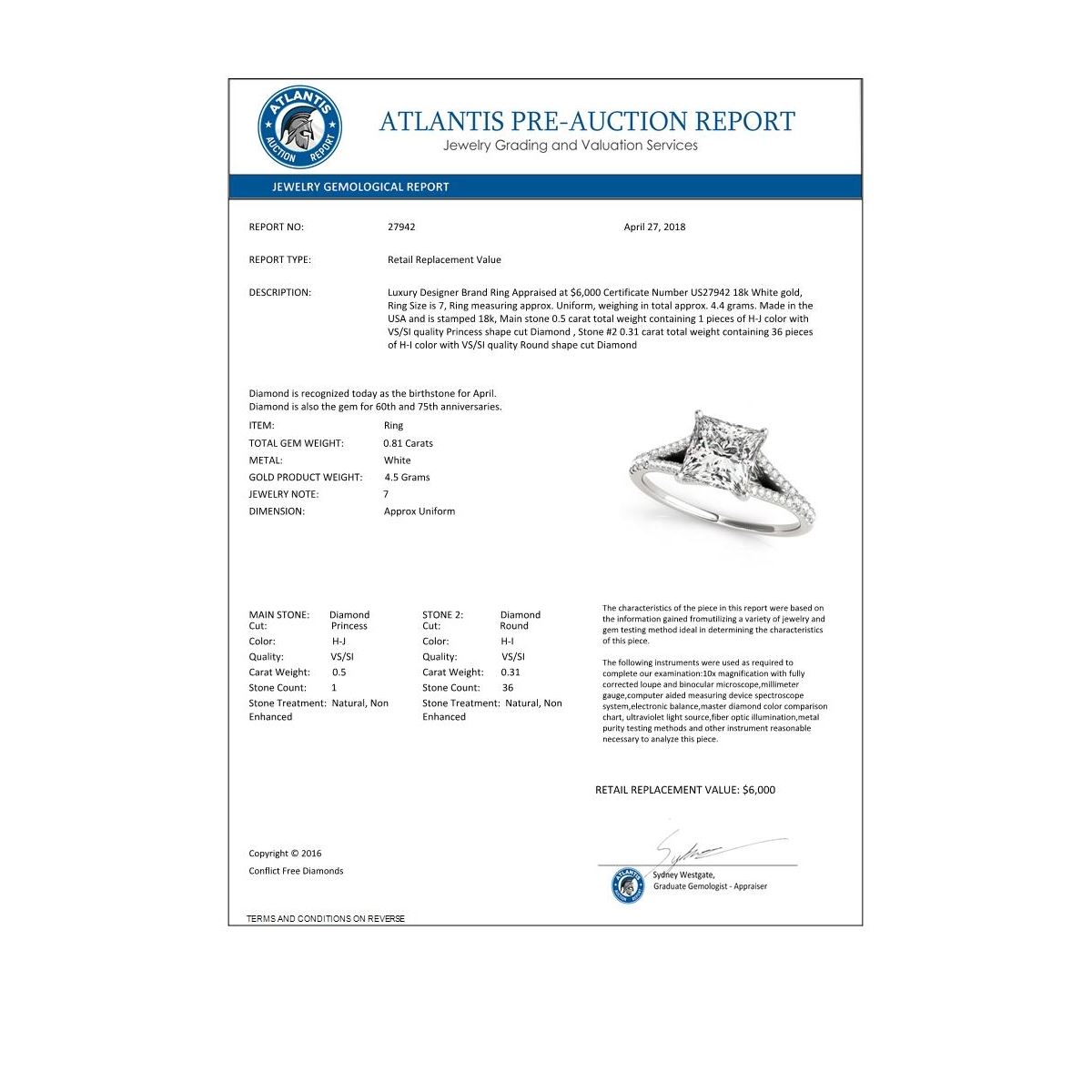 REF-121W3F -27942 ---- 0.81 CTW Certified VS/SI Princess Diamond Solitaire Ring 18K White Gold ---- Luxury Designer Brand Ring Appraised at $6,000 Certificate Number US27942 18k White gold, Ring Size is 7, Ring measuring approx. Uniform, weighing in total approx. 4.4 grams. Made in the USA and is stamped 18k, Main stone 0.5 carat total weight containing 1 pieces of H-J color with VS/SI quality Princess shape cut Diamond , Stone #2 0.31 carat total weight containing 36 pieces of H-I color with VS/SI quality Round shape cut Diamond