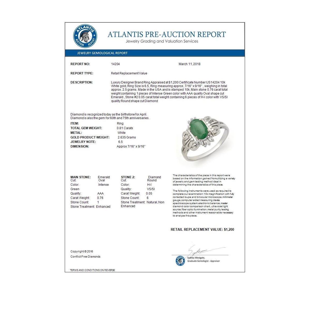 REF-18M2H -14204 ---- 0.81 CTW Emerald & Diamond Ring 10K White Gold ---- Luxury Designer Brand Ring Appraised at $1,200 Certificate Number US14204 10k White gold, Ring Size is 6.5, Ring measuring approx. 7/16" x 9/16" , weighing in total approx. 2.5 grams. Made in the USA and is stamped 10k, Main stone 0.76 carat total weight containing 1 pieces of Intense Green color with AAA quality Oval shape cut Emerald , Stone #2 0.05 carat total weight containing 6 pieces of H-I color with VS/SI quality Round shape cut Diamond