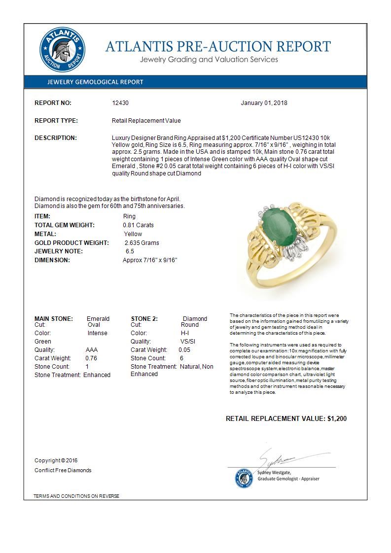REF-18H2A -12430 ---- 0.81 CTW Emerald & Diamond Ring 10K Yellow Gold ---- Luxury Designer Brand Ring Appraised at $1,200 Certificate Number US12430 10k Yellow gold, Ring Size is 6.5, Ring measuring approx. 7/16" x 9/16" , weighing in total approx. 2.5 grams. Made in the USA and is stamped 10k, Main stone 0.76 carat total weight containing 1 pieces of Intense Green color with AAA quality Oval shape cut Emerald , Stone #2 0.05 carat total weight containing 6 pieces of H-I color with VS/SI quality Round shape cut Diamond