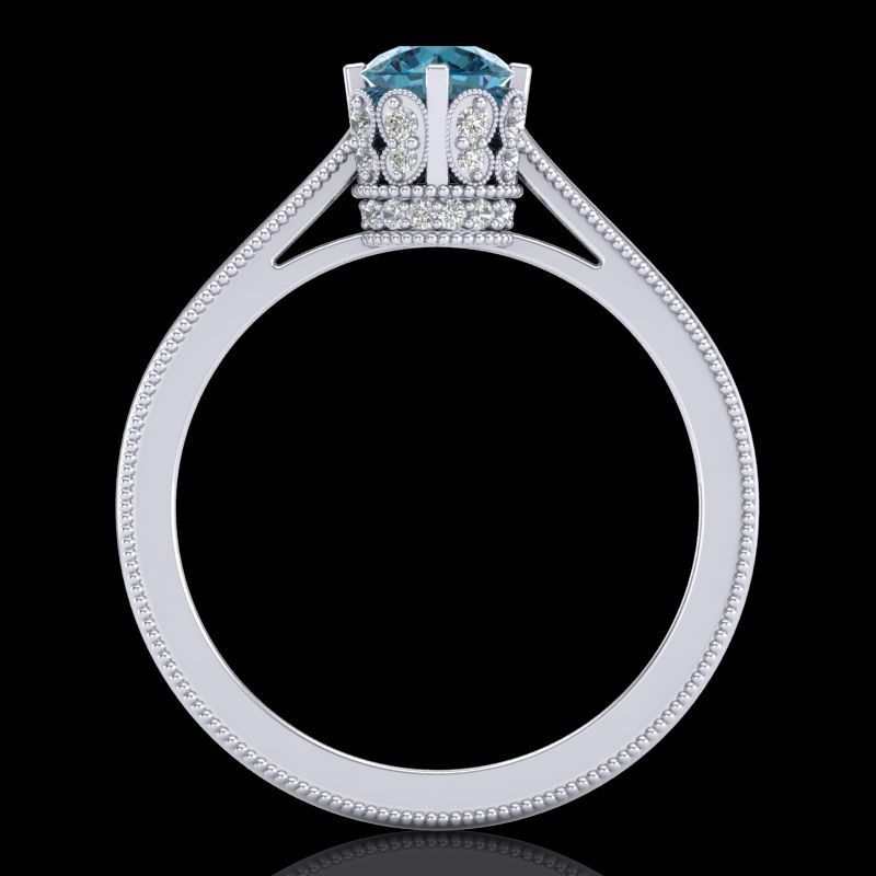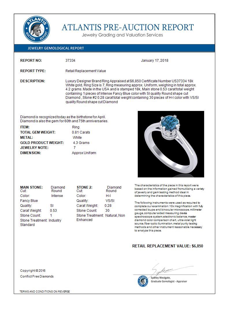 REF-103A6X -37334 ---- 0.81 CTW Fancy Intense Blue Diamond Solitaire Art Deco Ring 18K White Gold ---- Luxury Designer Brand Ring Appraised at $6,850 Certificate Number US37334 18k White gold, Ring Size is 7, Ring measuring approx. Uniform, weighing in total approx. 4.2 grams. Made in the USA and is stamped 18k, Main stone 0.53 carat total weight containing 1 pieces of Intense Fancy Blue color with SI quality Round shape cut Diamond , Stone #2 0.28 carat total weight containing 30 pieces of H-I color with VS/SI quality Round shape cut Diamond