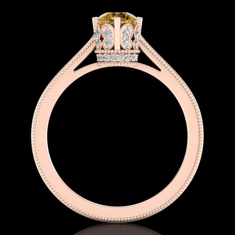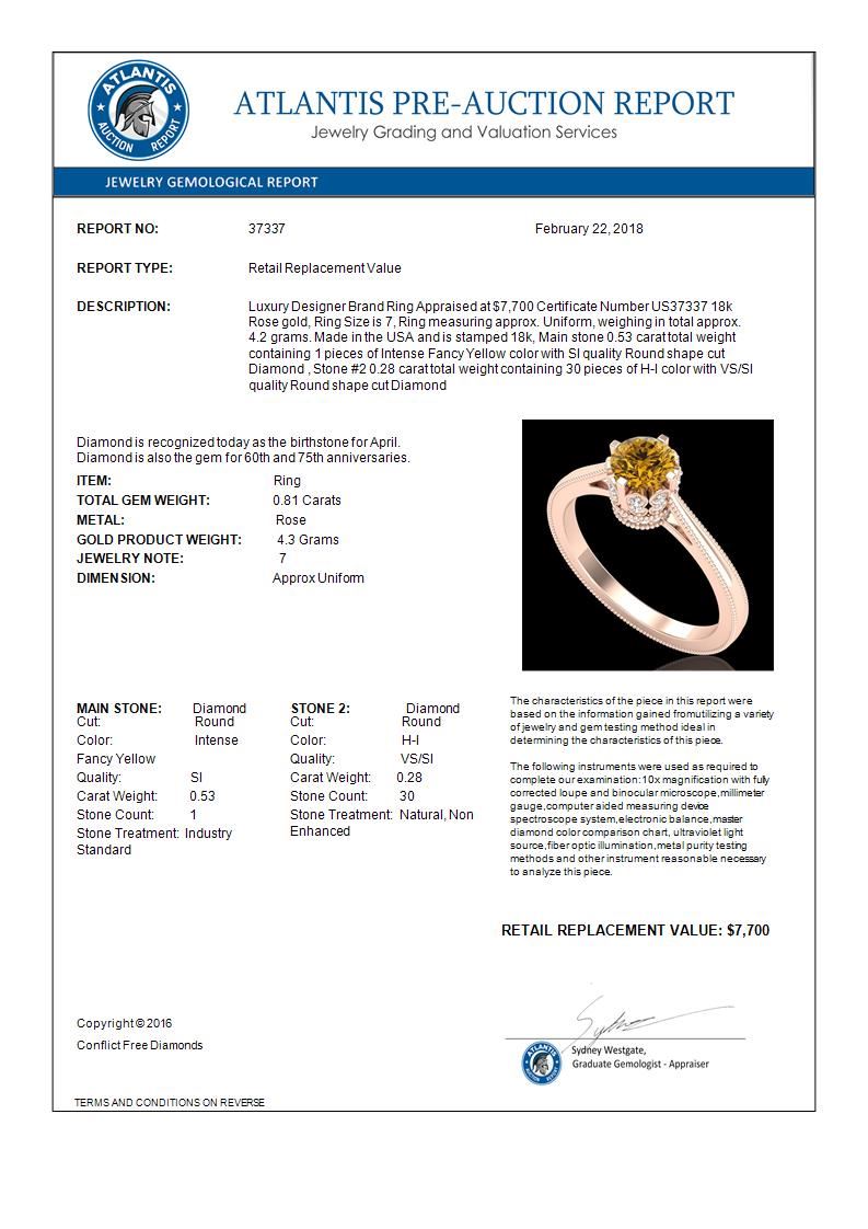 REF-127K3W -37337 ---- 0.81 CTW Intense Fancy Yellow Diamond Engagement Art Deco Ring 18K Rose Gold ---- Luxury Designer Brand Ring Appraised at $7,700 Certificate Number US37337 18k Rose gold, Ring Size is 7, Ring measuring approx. Uniform, weighing in total approx. 4.2 grams. Made in the USA and is stamped 18k, Main stone 0.53 carat total weight containing 1 pieces of Intense Fancy Yellow color with SI quality Round shape cut Diamond , Stone #2 0.28 carat total weight containing 30 pieces of H-I color with VS/SI quality Round shape cut Diamond