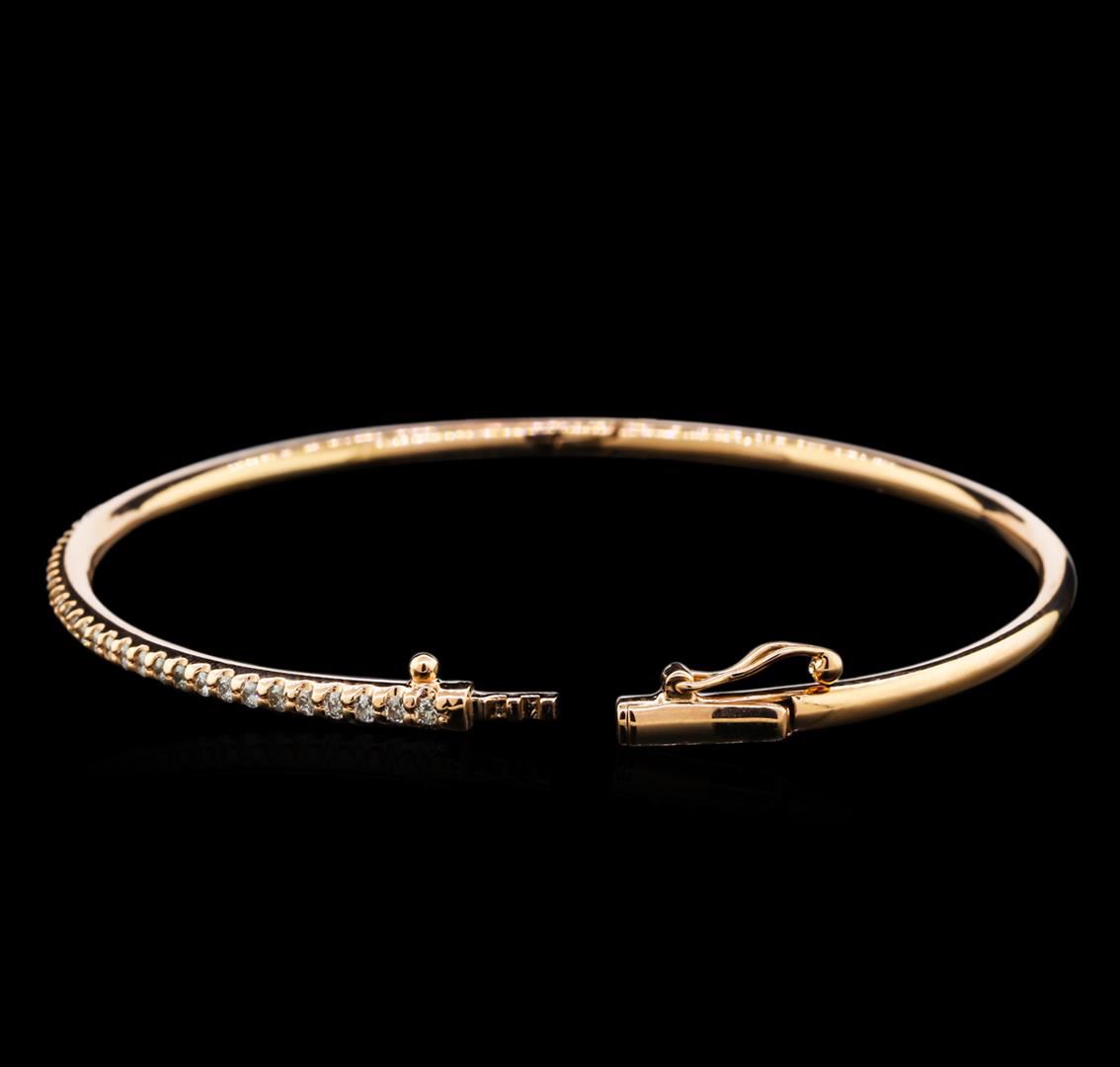 One electronically tested 14KT rose gold lady's combination cast & assembled fashion bangle bracelet with a tongue clasp with foldover safety with a bright polish finish. The featured lady's bangle bracelet measures approximately 6.5 inches in length. Identified with markings of "K14". Condition is new, good workmanship. Containing: Fifty prong set round brilliant cut diamonds, measuring 1.65 - 1.60 x 1.01mm (depth est.) approximate total weight of 50 Stones = 0.81ct. Graded in the setting. Clarity: SI-1 to I-1. Color: H - I. Cut Good. Total Weight of Diamonds 0.81ct. Total Weight of Bangle Bracelet 10.50gm. GAS Appraised at $3,940.00.