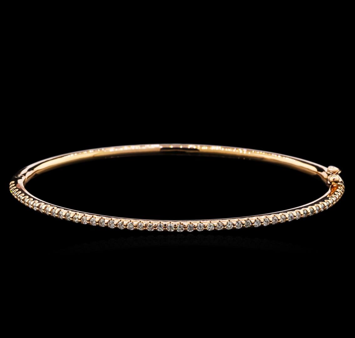 One electronically tested 14KT rose gold lady's combination cast & assembled fashion bangle bracelet with a tongue clasp with foldover safety with a bright polish finish. The featured lady's bangle bracelet measures approximately 6.5 inches in length. Identified with markings of "K14". Condition is new, good workmanship. Containing: Fifty prong set round brilliant cut diamonds, measuring 1.65 - 1.60 x 1.01mm (depth est.) approximate total weight of 50 Stones = 0.81ct. Graded in the setting. Clarity: SI-1 to I-1. Color: H - I. Cut Good. Total Weight of Diamonds 0.81ct. Total Weight of Bangle Bracelet 10.50gm. GAS Appraised at $3,940.00.