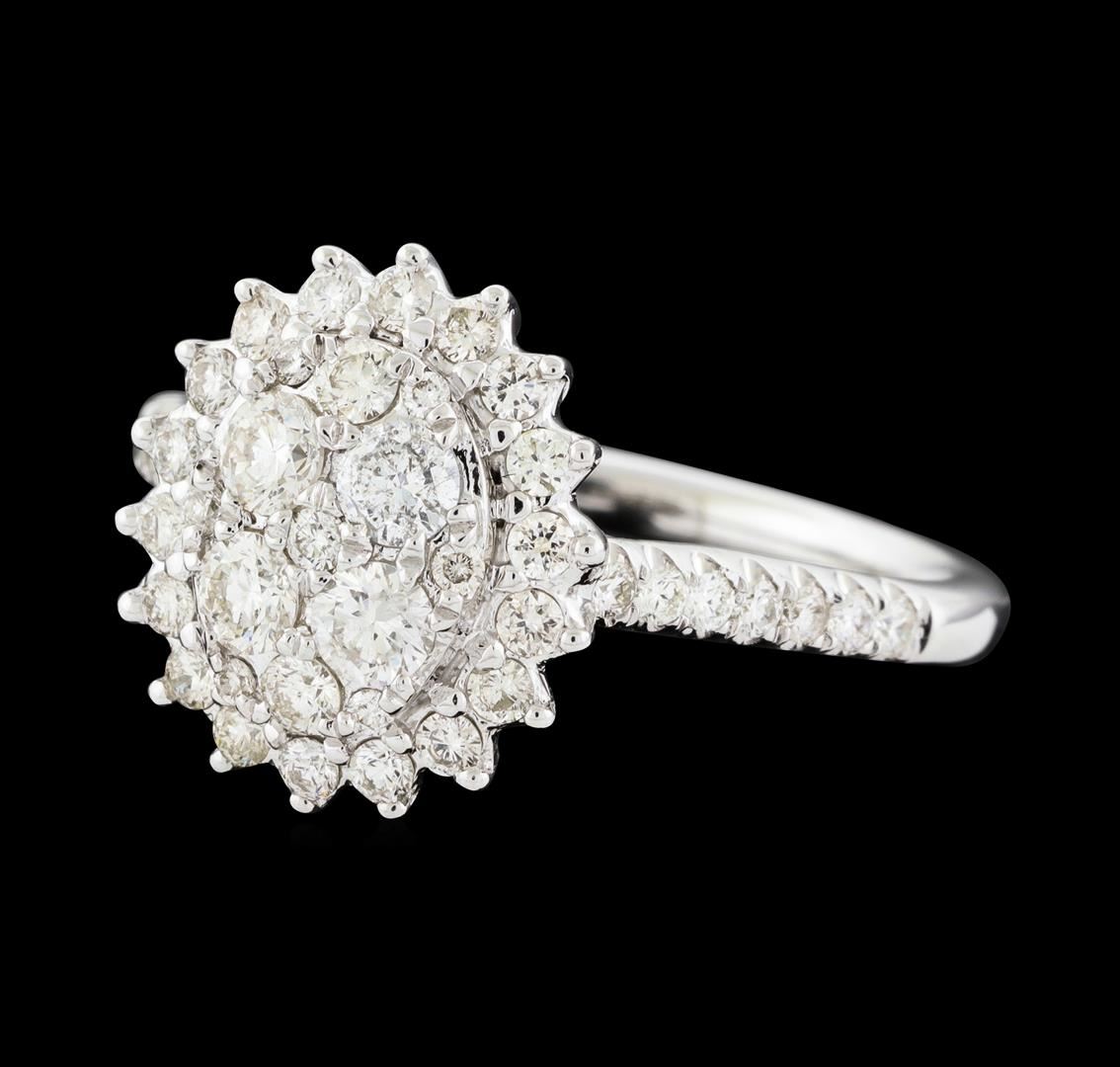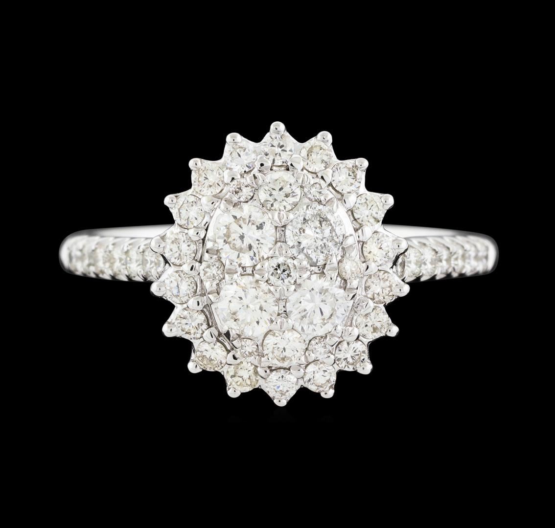 One electronically tested 14KT white gold lady's cast fashion ring with a oval cluster with a bright polish finish. The featured lady's ring has a shank measuring 1.86 millimeters wide. Identified with markings of '14K'. Condition is new, good workmanship. Containing: Four prong set round brilliant cut diamonds, measuring 2.90 - 2.85 x 1.79mm (depth est.) approximate total weight of 4 Stones = 0.37ct. Graded in the setting. Clarity SI-1 to SI-2. Color: H - I Cut Good Two prong set round brilliant cut diamonds, measuring 2.20 - 2.15 x 1.35mm (depth est.) approximate total weight of 2 Stones = 0.08ct. Graded in the setting. Clarity SI-1. Color: I Cut Good Thirty-Three prong set round brilliant cut diamonds, measuring 1.50 - 1.30 x 0.84mm (depth est.) approximate total weight of 33 Stones = 0.33ct. Graded in the setting. Clarity SI-1 to SI-2. Color: H - J Cut Good Six prong set round brilliant cut diamonds, measuring 1.15 - 1.05 x 0.68mm (depth est.) approximate total weight of 6 Stones = 0.03ct. Graded in the setting. Clarity SI-1 to SI-2. Color: H - I Cut Good. Total Weight of Diamonds 0.81ct.. Total Weight of Ring 3.70gm. GAS Appraised at $2,670.00.