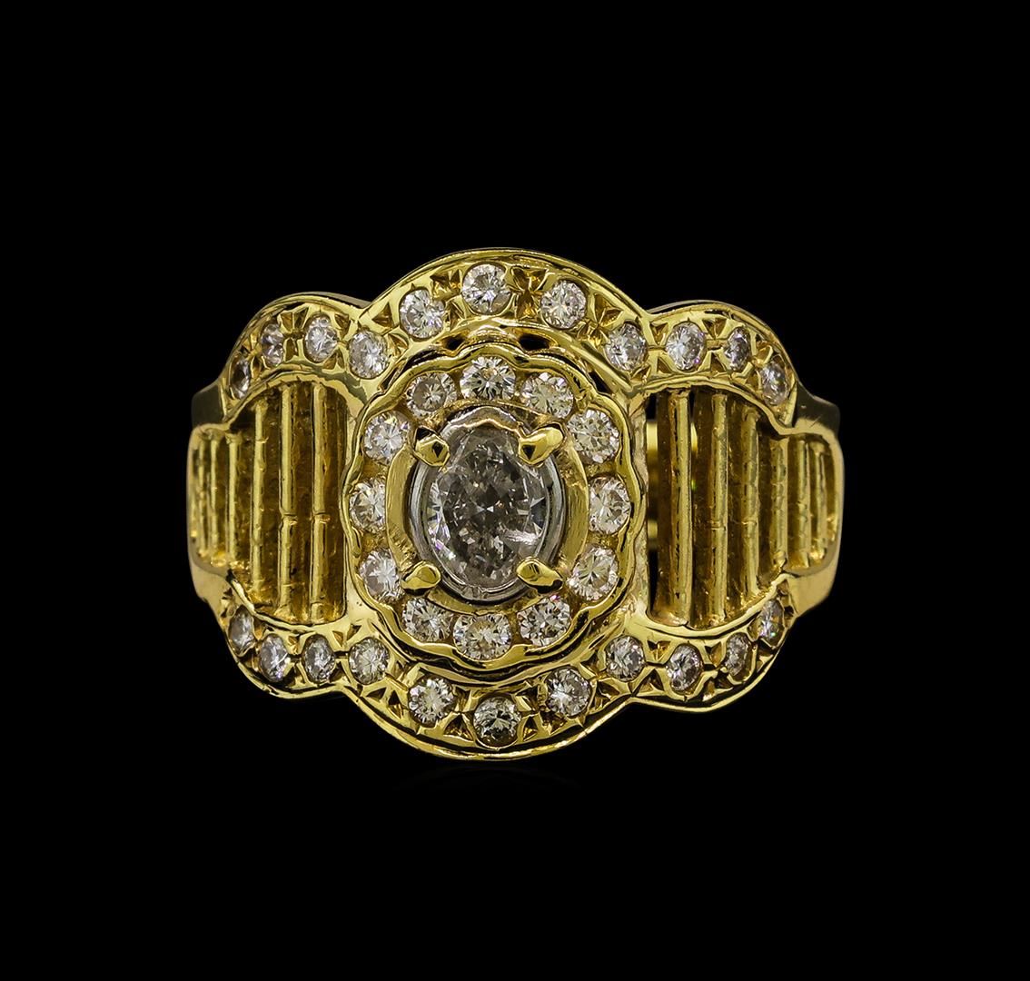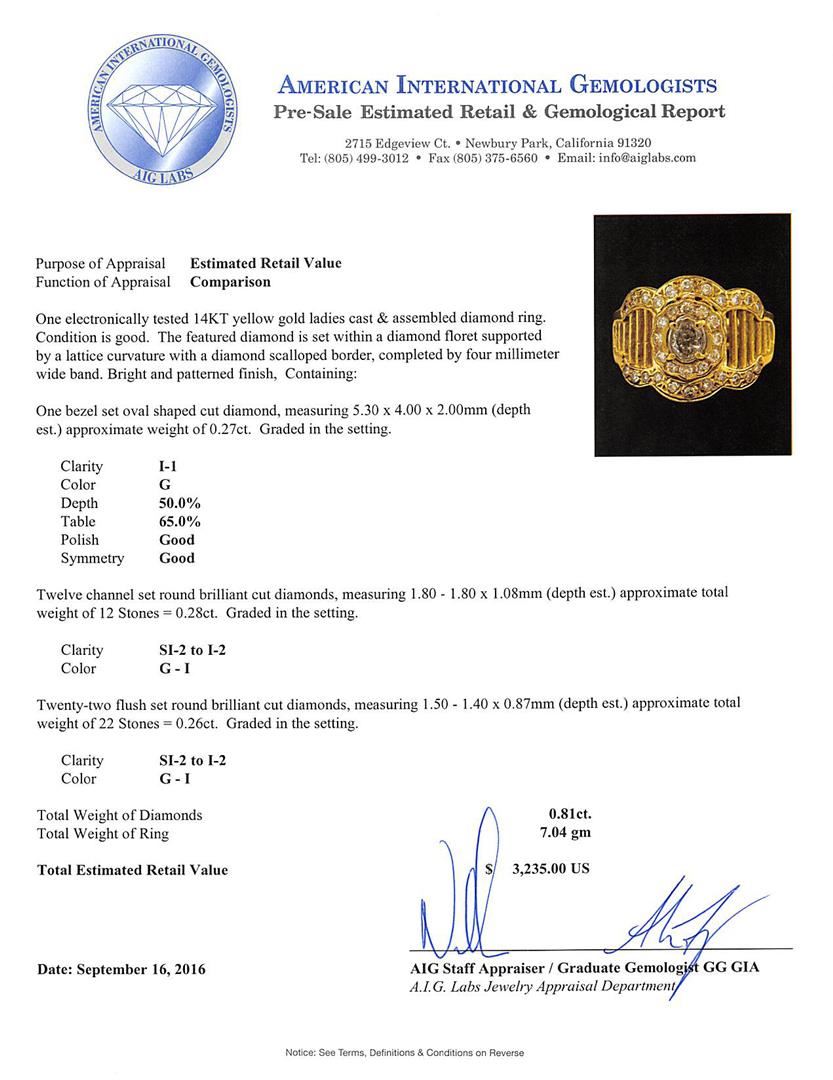 One electronically tested 14KT yellow gold ladies cast & assembled diamond ring. The featured diamond is set within a diamond floret supported by a lattice curvature with a diamond scalloped border, completed by four millimeter wide band. Bright and patterned finish, Condition is good. Containing: One bezel set oval shaped cut diamond, measuring 5.30 x 4.00 x 2.00mm (depth est.) approximate weight of 0.27ct. Graded in the setting. Clarity I-1. Color: G Depth 50.0%. Table: 65.0%. Twelve channel set round brilliant cut diamonds, measuring 1.80 - 1.80 x 1.08mm (depth est.) approximate total weight of 12 Stones = 0.28ct. Graded in the setting. Clarity SI-2 to I-2. Color: G - I Twenty-Two flush set round brilliant cut diamonds, measuring 1.50 - 1.40 x 0.87mm (depth est.) approximate total weight of 22 Stones = 0.26ct. Graded in the setting. Clarity SI-2 to I-2. Color: G - I. Total Weight of Diamonds 0.81ct.. Total Weight of Ring 7.04gm. AIG Appraised at $3,235.00.