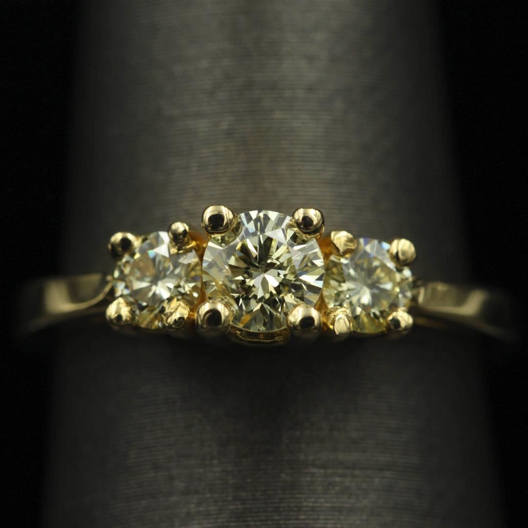 One lady's three stone ring featuring: 14KT yellow gold weighing 3.38 grams containing three diamonds weighing 0.81ctw. The diamonds are round brilliant cut with SI1-SI2 clarity and I-J color. The ring is a size 5.50 but can be resized.