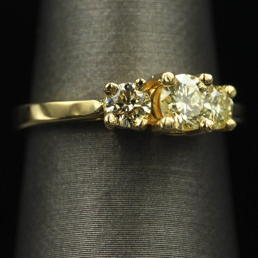 One lady's three stone ring featuring: 14KT yellow gold weighing 3.38 grams containing three diamonds weighing 0.81ctw. The diamonds are round brilliant cut with SI1-SI2 clarity and I-J color. The ring is a size 5.50 but can be resized.