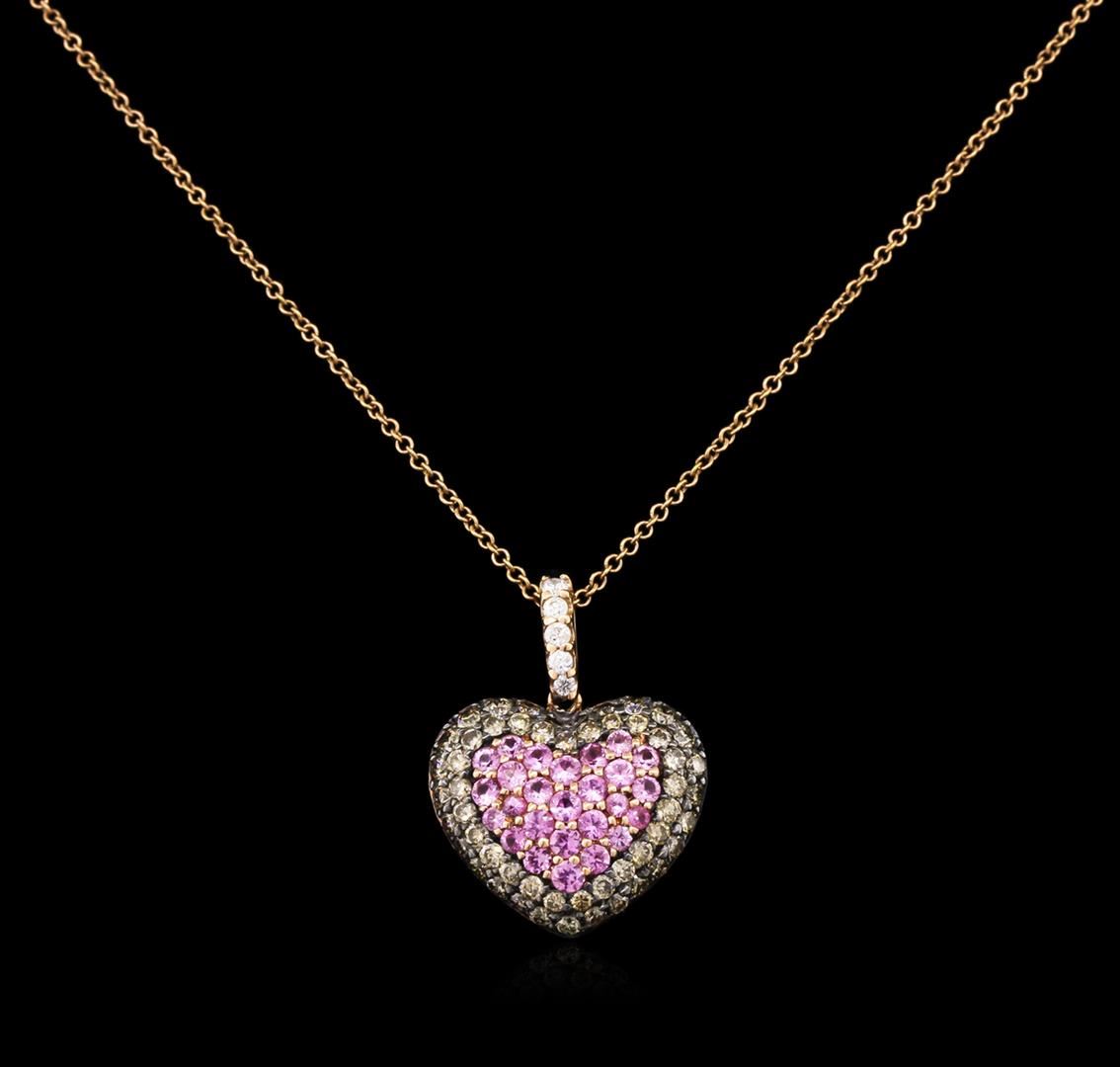 One heart pendant with chain featuring: 14KT rose gold weighing 3.60 grams containing pink sapphires with a total weight of 0.81ct and white and brown diamonds with a total weight of 1.14ct.