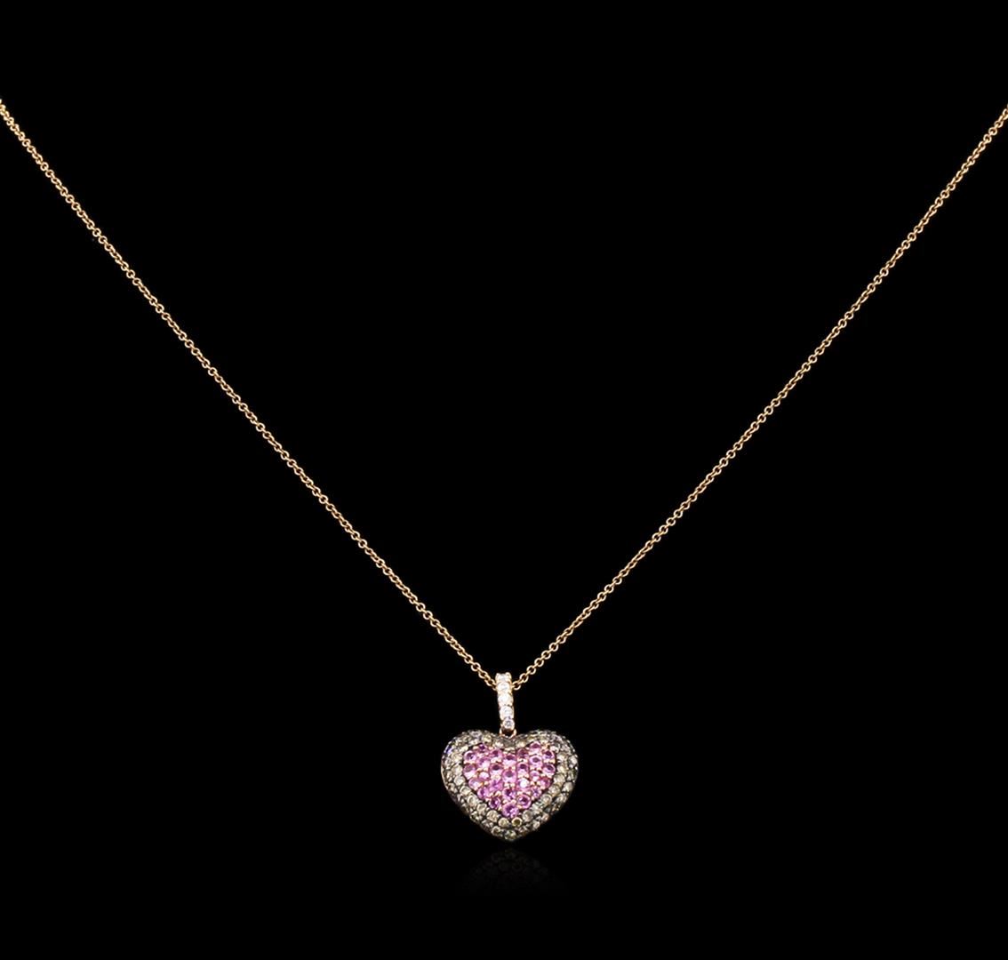 One heart pendant with chain featuring: 14KT rose gold weighing 3.60 grams containing pink sapphires with a total weight of 0.81ct and white and brown diamonds with a total weight of 1.14ct.