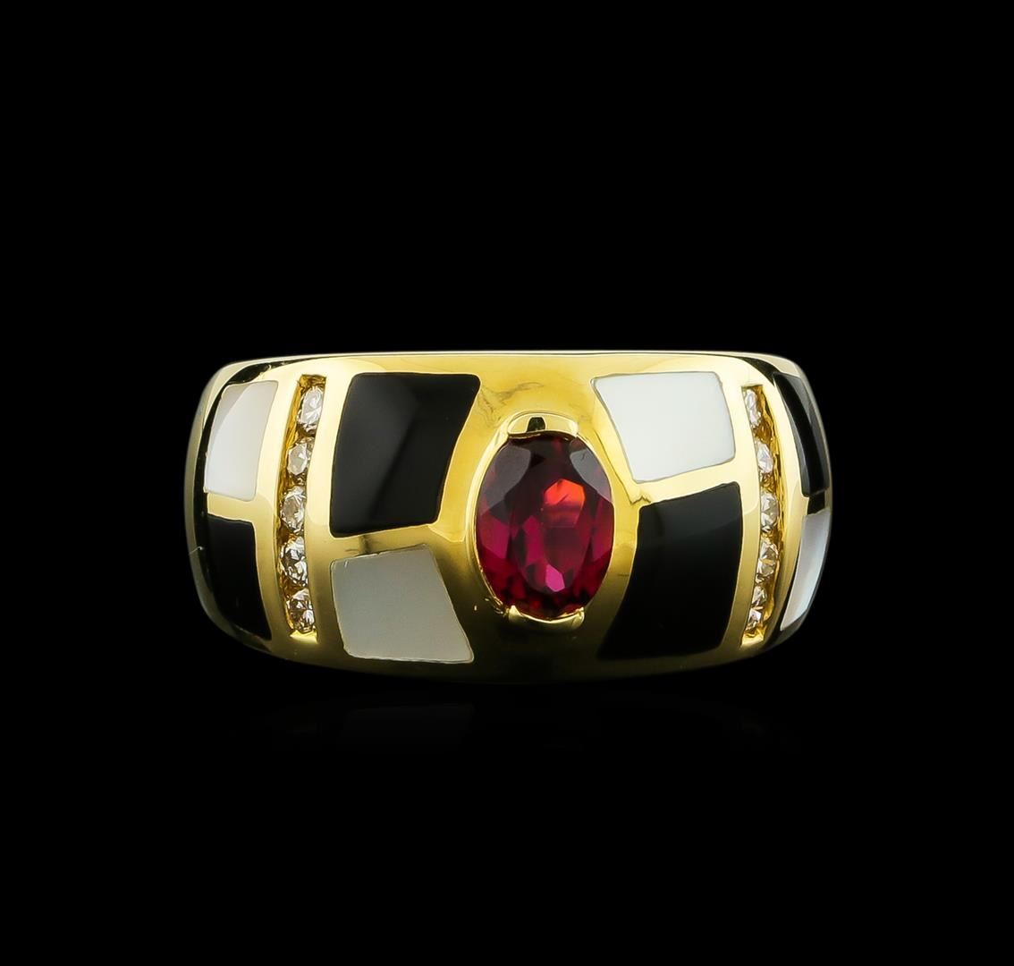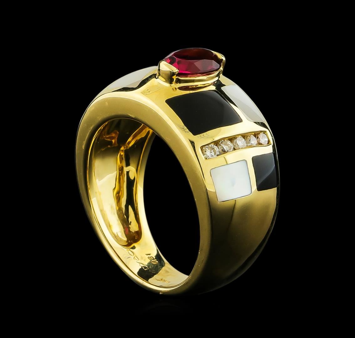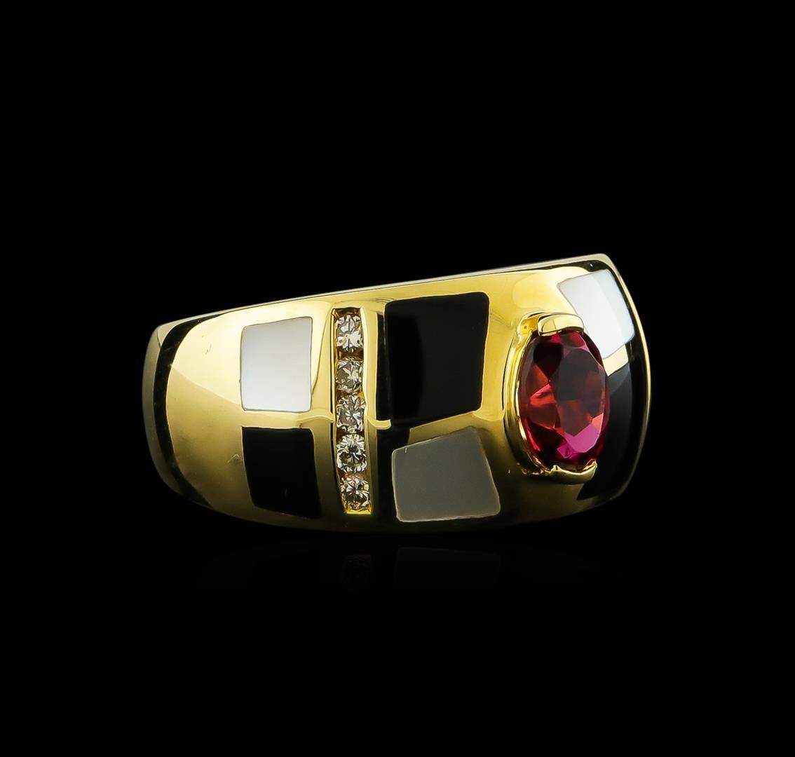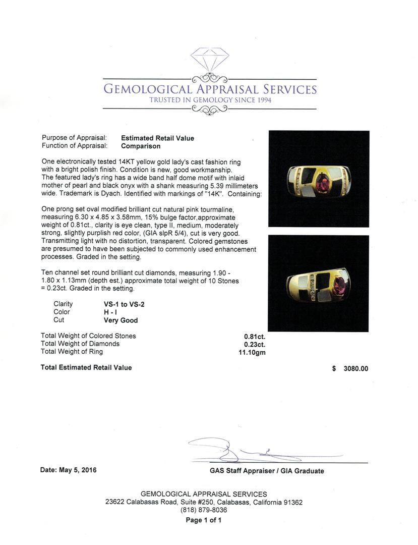One electronically tested 14KT yellow gold lady's cast fashion ring with a bright polish finish. The featured lady's ring has a wide band half dome motif with inlaid mother of pearl and black onyx with a shank measuring 5.39 millimeters wide. Trademark is Dyach. Identified with markings of "14K". Condition is new, good workmanship. Containing: One prong set oval modified brilliant cut natural pink tourmaline, measuring 6.30 x 4.85 x 3.58mm, 15%. bulge factor, approximate weight of 0.81ct., clarity is eye clean, type II, medium, moderately strong, slightly purplish red color, (GIA slpR 5/4), cut is very good. Transmitting light with no distortion, transparent. Colored gemstones are presumed to have been subjected to commonly used enhancement processes. Graded in the setting. Ten channel set round brilliant cut diamonds, measuring 1.90 - 1.80 x 1.13mm (depth est.) approximate total weight of 10 Stones = 0.23ct. Graded in the setting. Clarity: VS-1 to VS-2. Color: H - I. Cut Very Good. Total Weight of Colored Stones 0.81ct. Total Weight of Diamonds 0.23ct. Total Weight of Ring 11.10gm GAS Appraised at $3,080.00.
