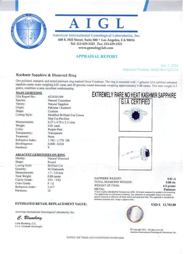 One polished, stamped. and tested platinum ring marked Oscar Friedman. The ring is mounted with: 1 genuine GIA certified unheated sapphire center stone weighing 0.81 carat, and 40 genuine round diamonds weighing approximately 0.88 carats. This item weighs 6.5 grams, condition is new, excellent workmanship. #MAIN GEMSTONE# GIA Report No.: 6234201389; Species: Natural Corundum; Variety: Natural Sapphire; Origin: Pakistan / Kashmir; Shape: Cushion; Cutting Style: Modified Brilliant Cut Crown, Step Cut Pavilion; Measurements: 6.27 x 4.70 x 3.11mm; Weight: 0.81 carat; Color: Purple-Pink; Transparency: Transparent; Treatment: None; Refractive Index: 1.762 - 1.770 DR; Birefringence: 0.008 - 0.010; Hardness: 9 #ADJACENT GEMSTONES ON RING# Identity: Natural Diamond; Shape: Round; Cutting Style: Brilliant Cut; Quantity: 40 Diamonds; Measurements: 1.7 - 2.0mm; Total Weight: 0.88 carats; Clarity Grade: VS1-VS2; Color Grade: F-G; Refractive Index: 2.417; Hardness: 10; SAPPHIRE WEIGHT: 0.81 ct; TOTAL DIAMOND WEIGHT: 0.88 cts; WEIGHT OF ITEM: 6.5 grams; METAL: Platinum #Size: 6 3/4
