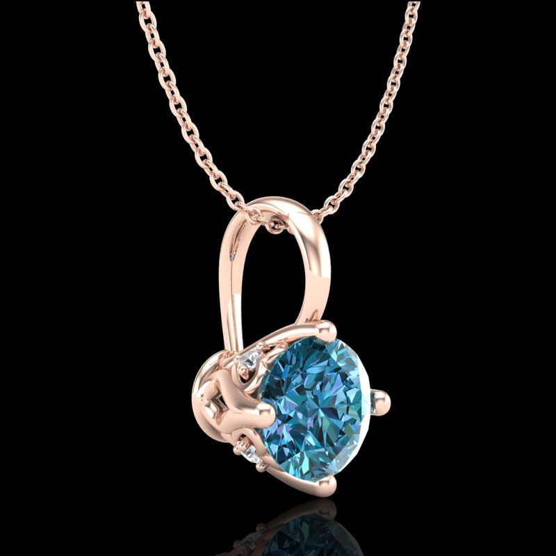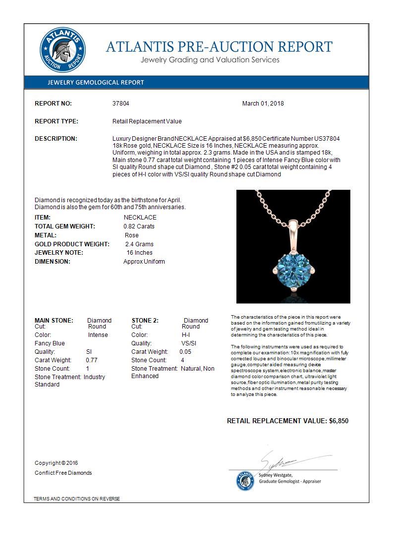REF-103H6A -37804 ---- 0.82 CTW Fancy Intense Blue Diamond Solitaire Art Deco Necklace 18K Rose Gold ---- Luxury Designer Brand NECKLACE Appraised at $6,850 Certificate Number US37804 18k Rose gold, NECKLACE Size is 16 Inches, NECKLACE measuring approx. Uniform, weighing in total approx. 2.3 grams. Made in the USA and is stamped 18k, Main stone 0.77 carat total weight containing 1 pieces of Intense Fancy Blue color with SI quality Round shape cut Diamond , Stone #2 0.05 carat total weight containing 4 pieces of H-I color with VS/SI quality Round shape cut Diamond