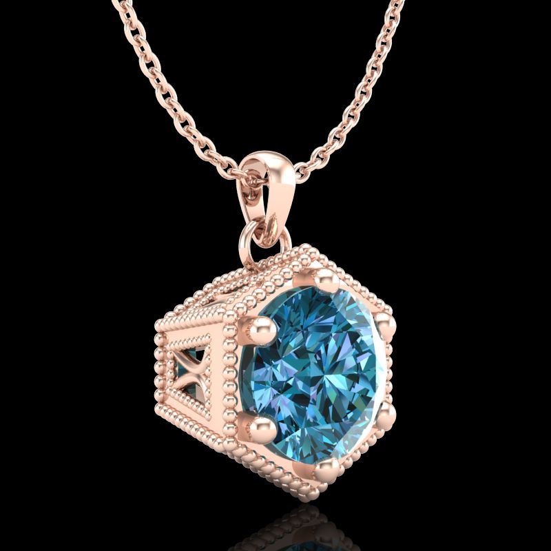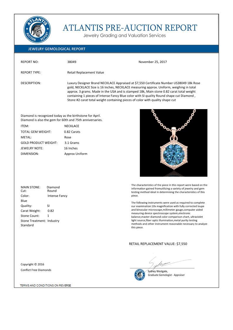 REF-114H5A -38049 ---- 0.82 CTW Fancy Intense Blue Diamond Solitaire Art Deco Necklace 18K Rose Gold ---- Luxury Designer Brand NECKLACE Appraised at $7,550 Certificate Number US38049 18k Rose gold, NECKLACE Size is 16 Inches, NECKLACE measuring approx. Uniform, weighing in total approx. 3 grams. Made in the USA and is stamped 18k, Main stone 0.82 carat total weight containing 1 pieces of Intense Fancy Blue color with SI quality Round shape cut Diamond , Stone #2 carat total weight containing pieces of color with quality shape cut